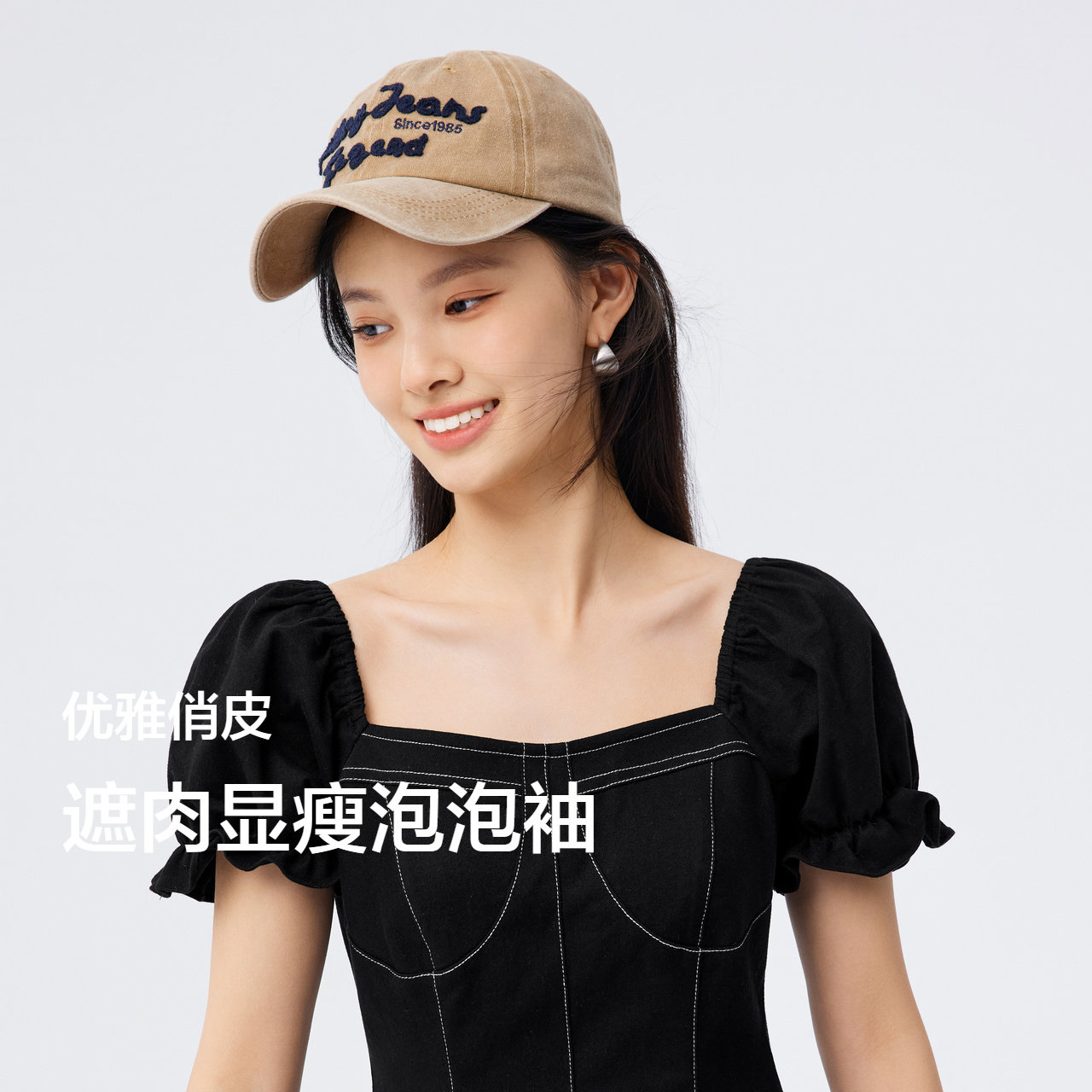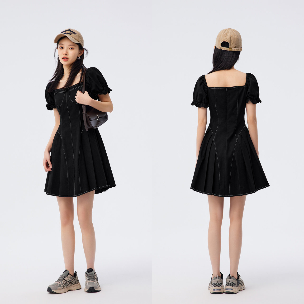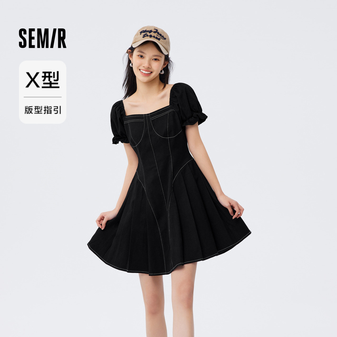森马连衣裙女泡泡袖方领优雅俏皮2023夏季新款辣妹显瘦明线百褶裙