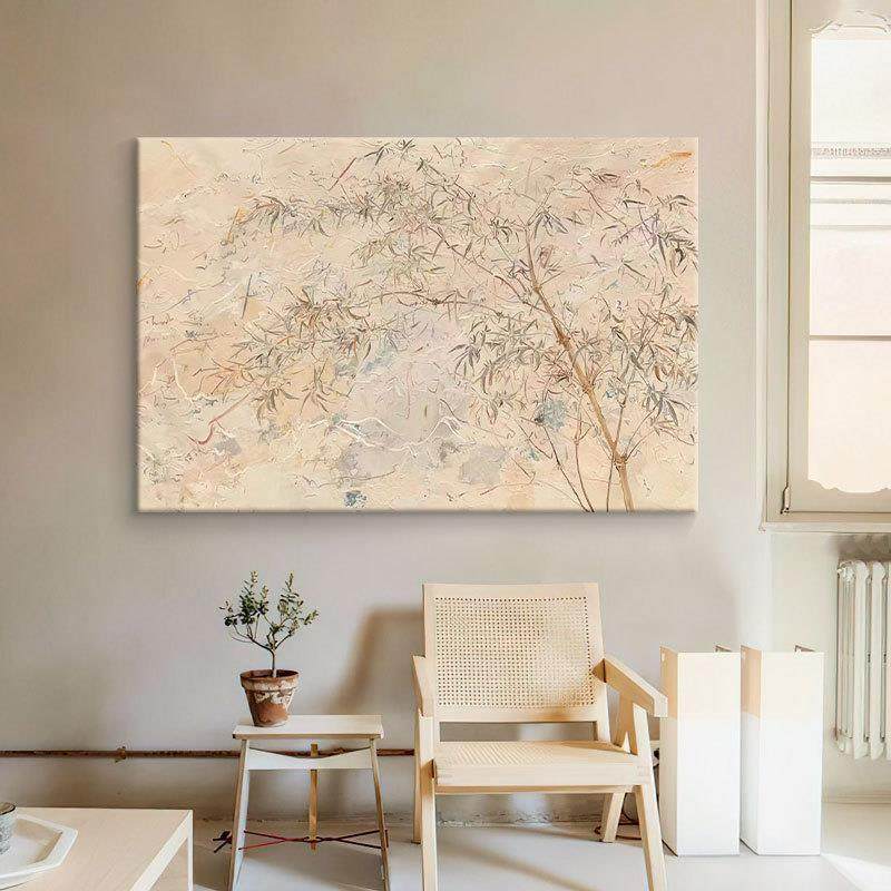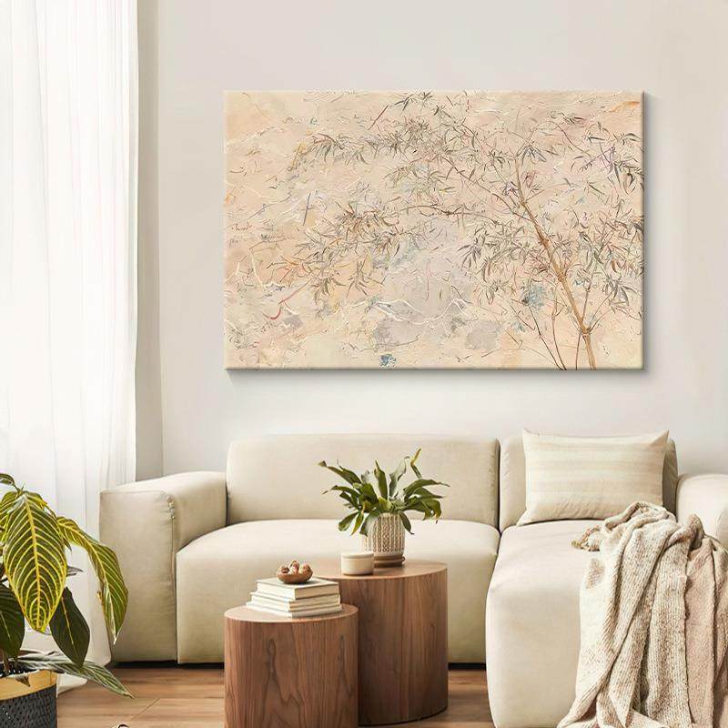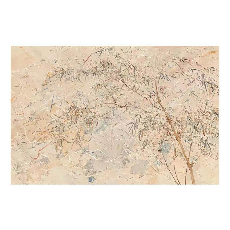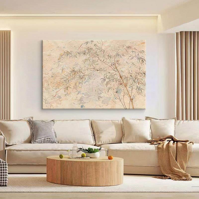 法式中古风竹子手绘油画无框原木风抽象竹叶装饰画客厅横肌理挂画