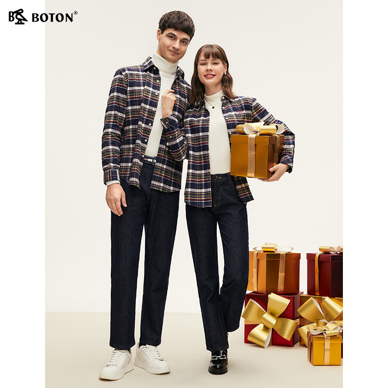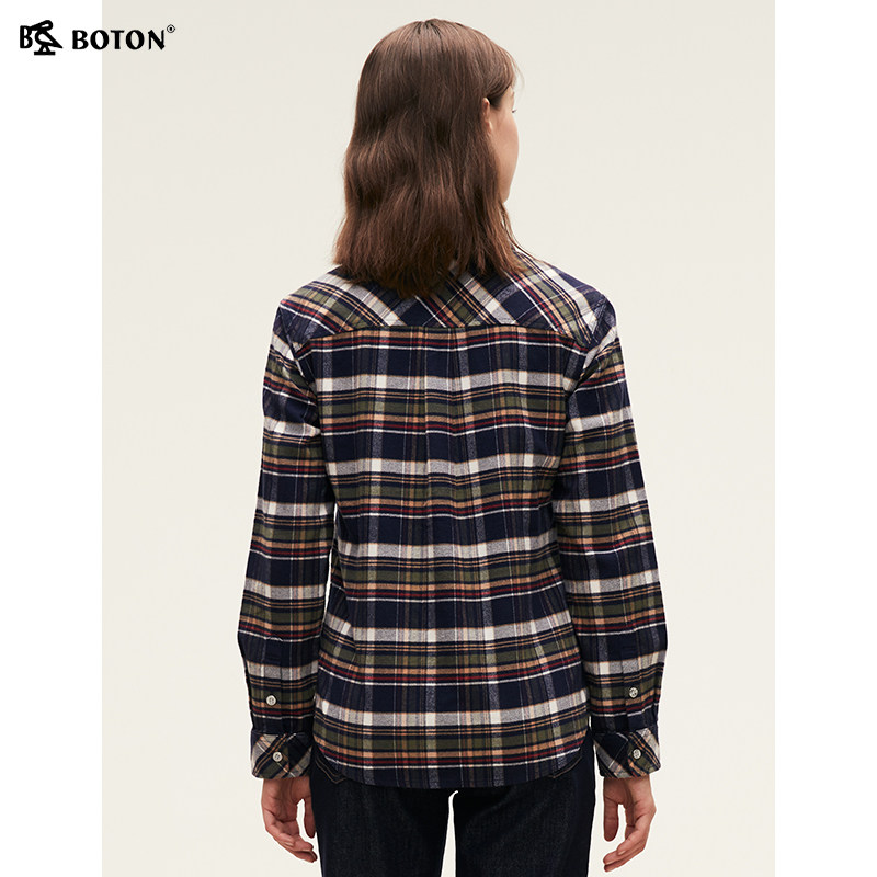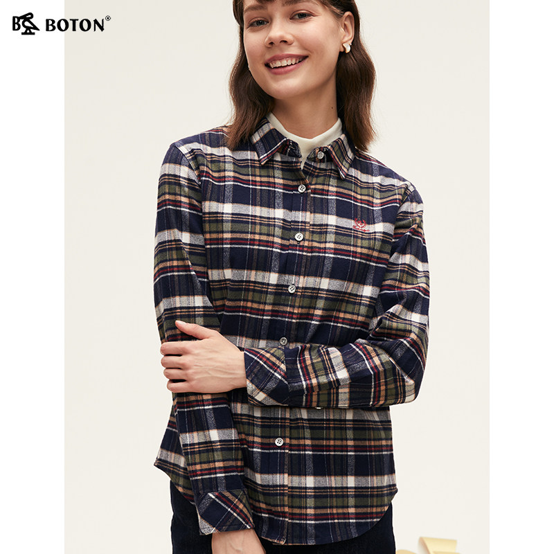 波顿2025年秋冬季新款蓝绿红色格子女士长袖衬衫高端美式休闲衬衣
