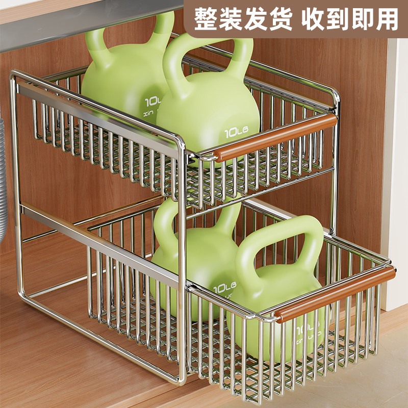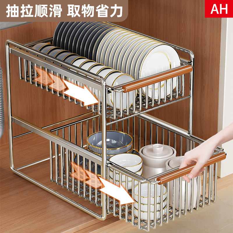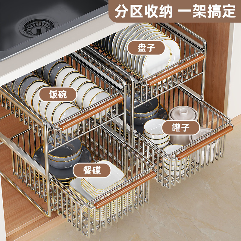 橱柜收纳新款多功能拉篮不锈钢碗碟收纳架抽屉式置物架抽拉分层架