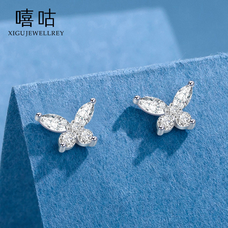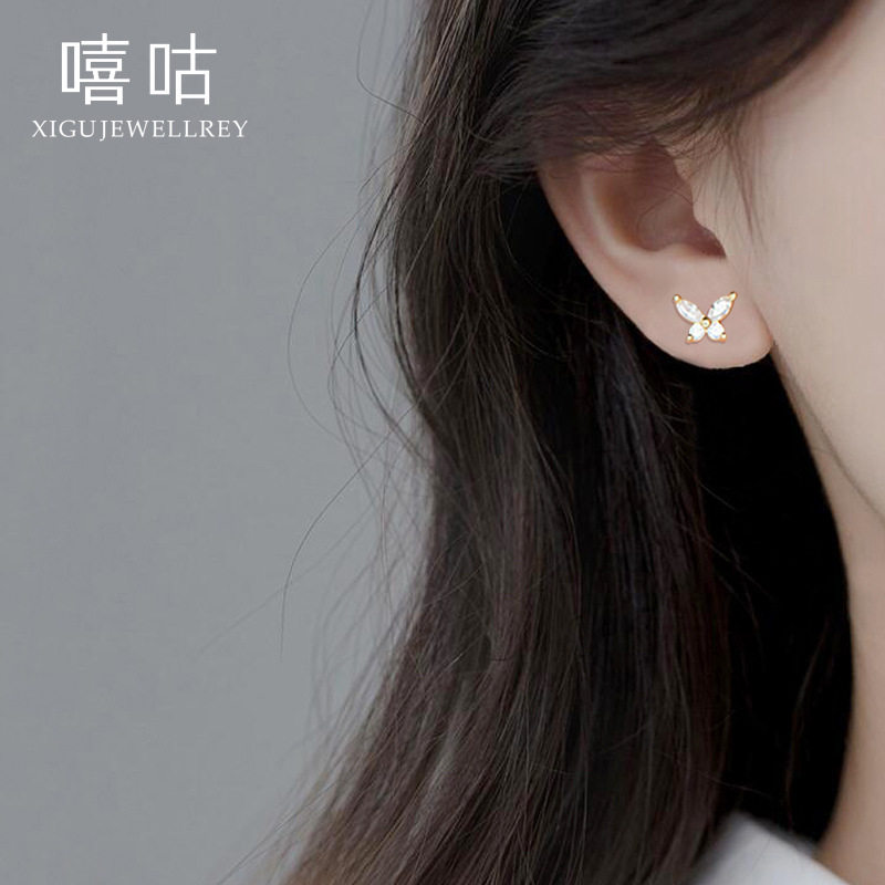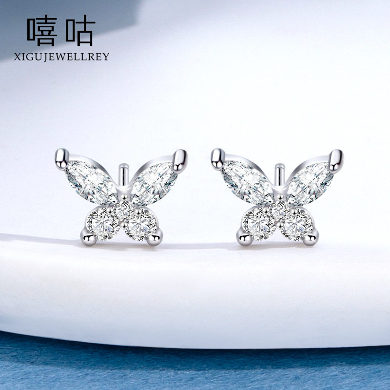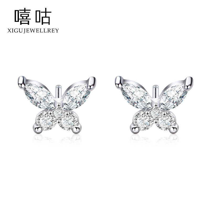 嘻咕E1462 通体S999银森系蝴蝶锆石耳钉韩版气质淑女养耳洞耳饰女