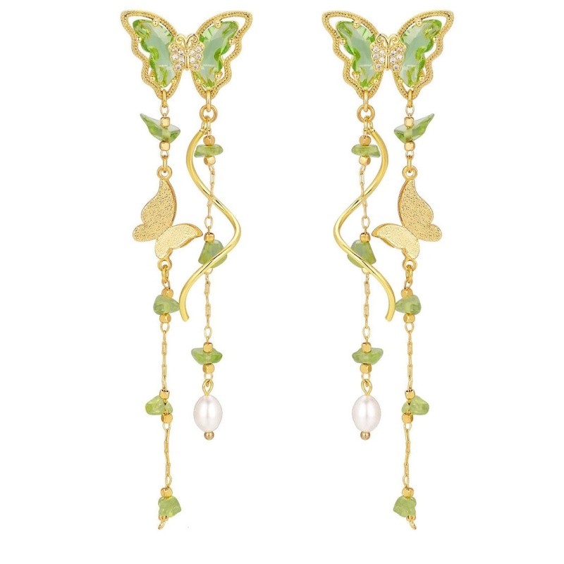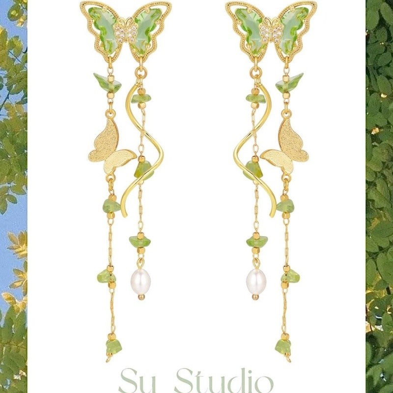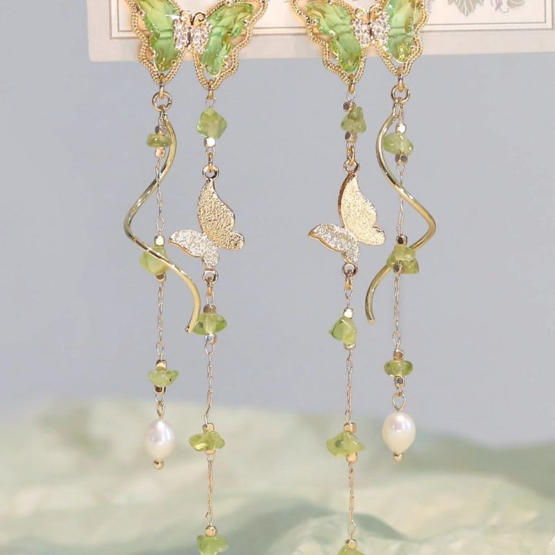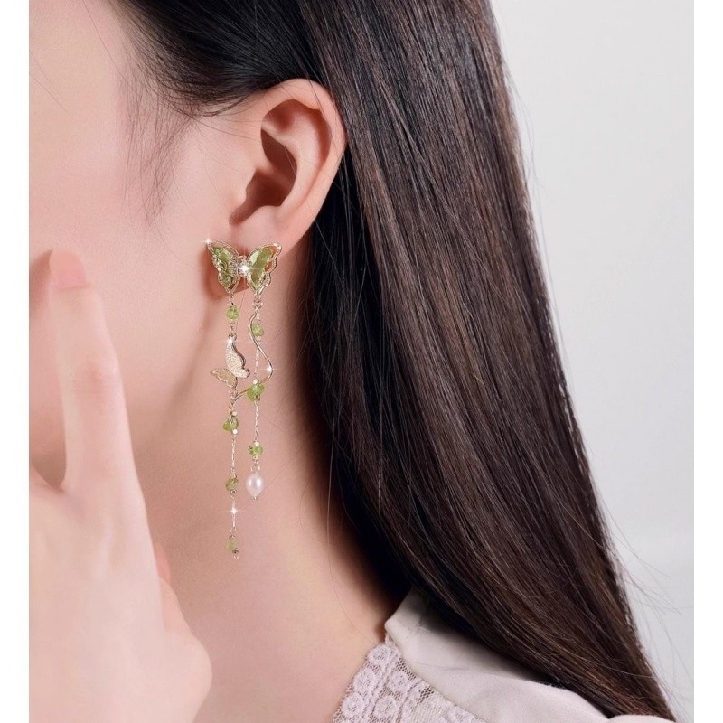 青野茶蝶 冷淡风超仙显瘦长款流苏蝴蝶银针耳钉无耳洞蚊香盘耳夹