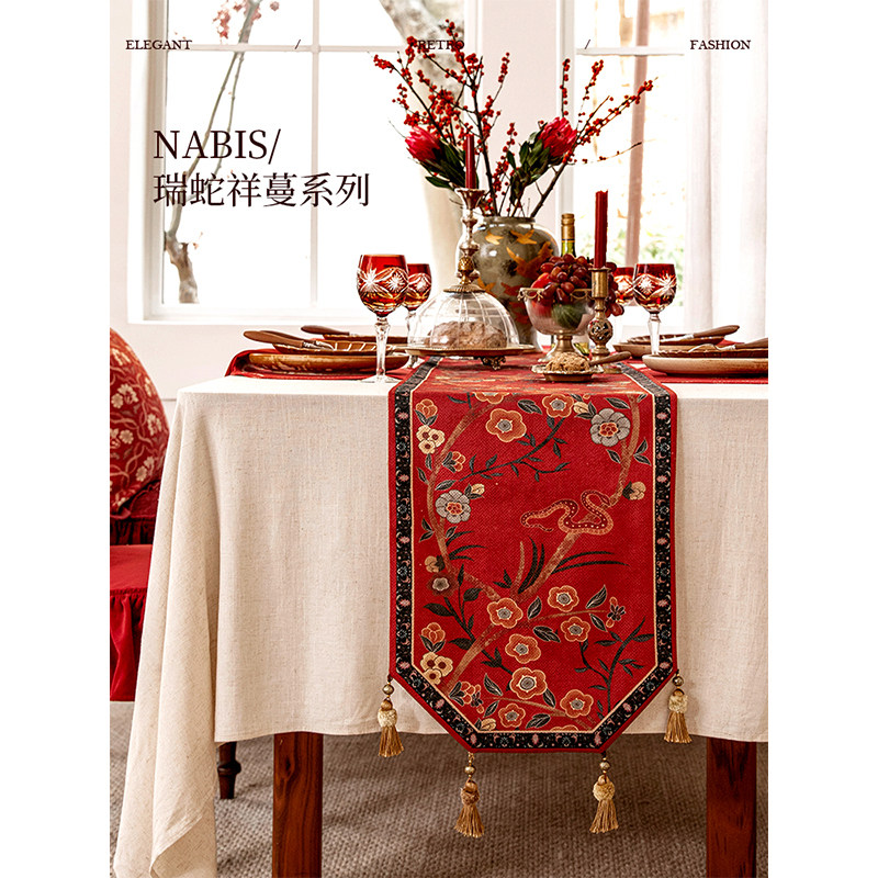 【第3件0元专区】蜡笔派瑞蛇祥蔓桌旗复古红色节日新婚餐桌布盖布