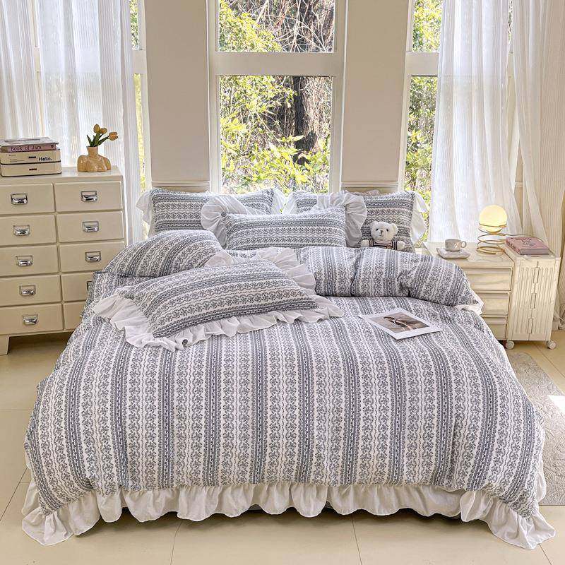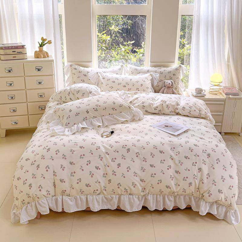 韩版纯色四件套小清新花边被套四件套水洗棉床单床裙宿舍三件套件