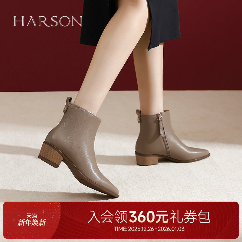 哈森尖头粗跟时装短靴冬季新款时尚羊皮女靴秋季单靴HA247601