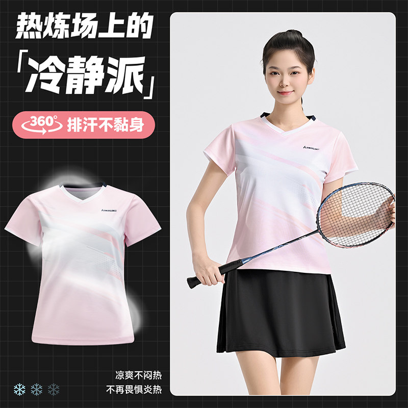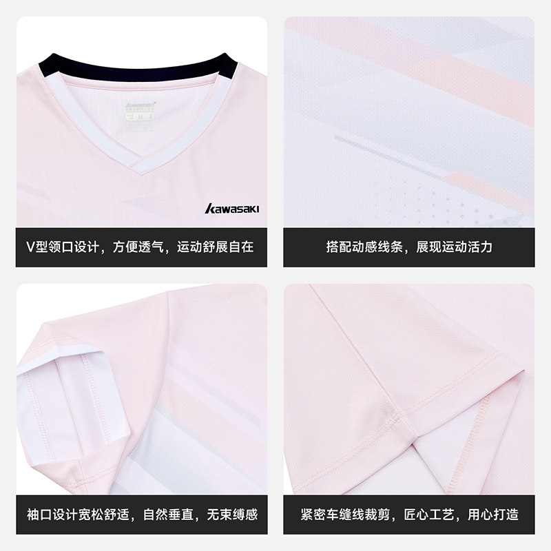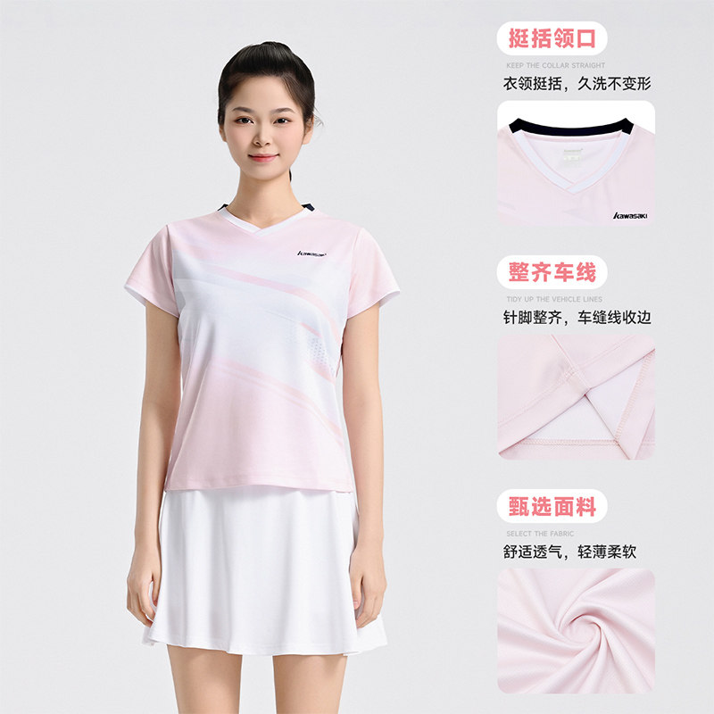 川崎KAWASAKI羽毛球服女款短袖速干透气运动比赛训练服攻剑V领T恤