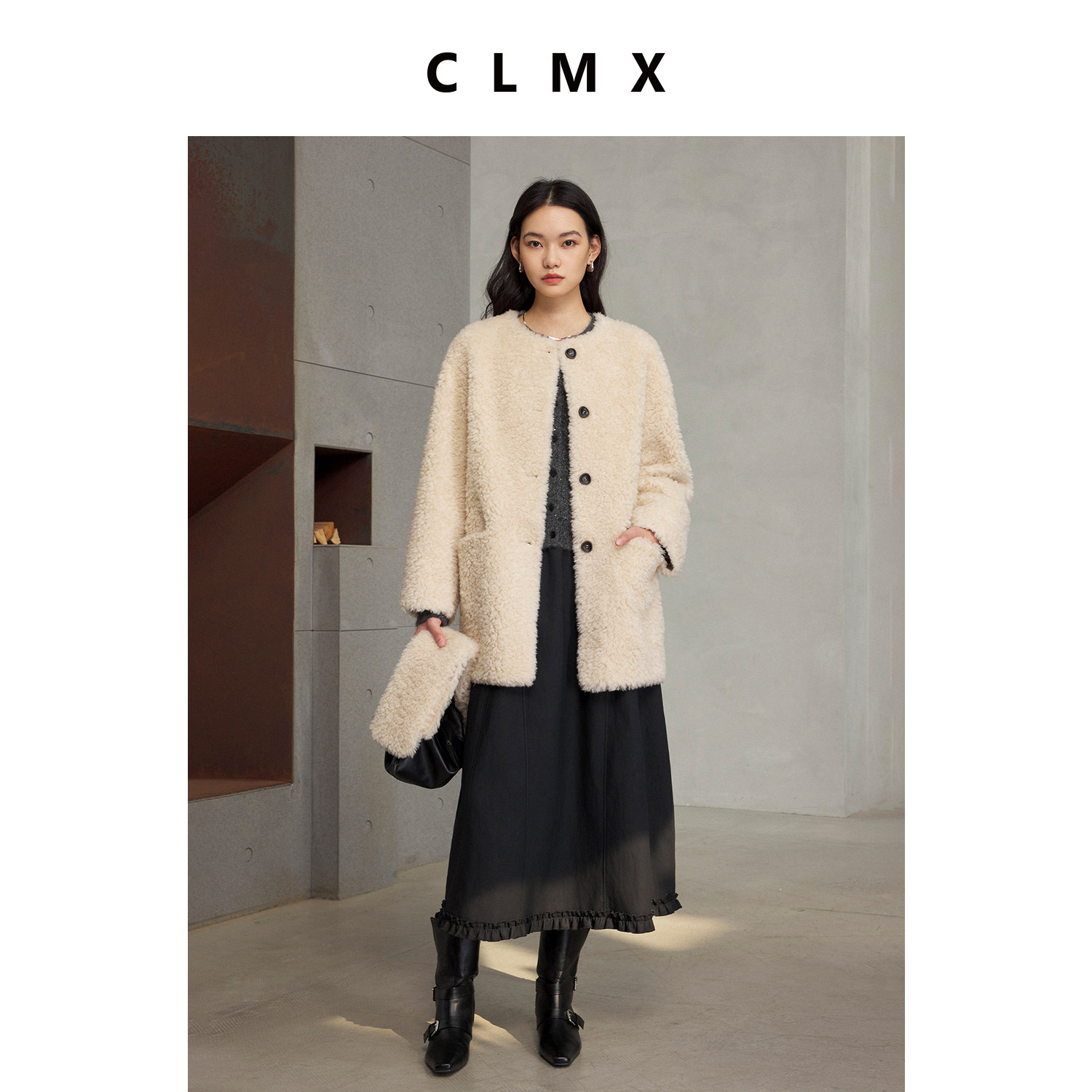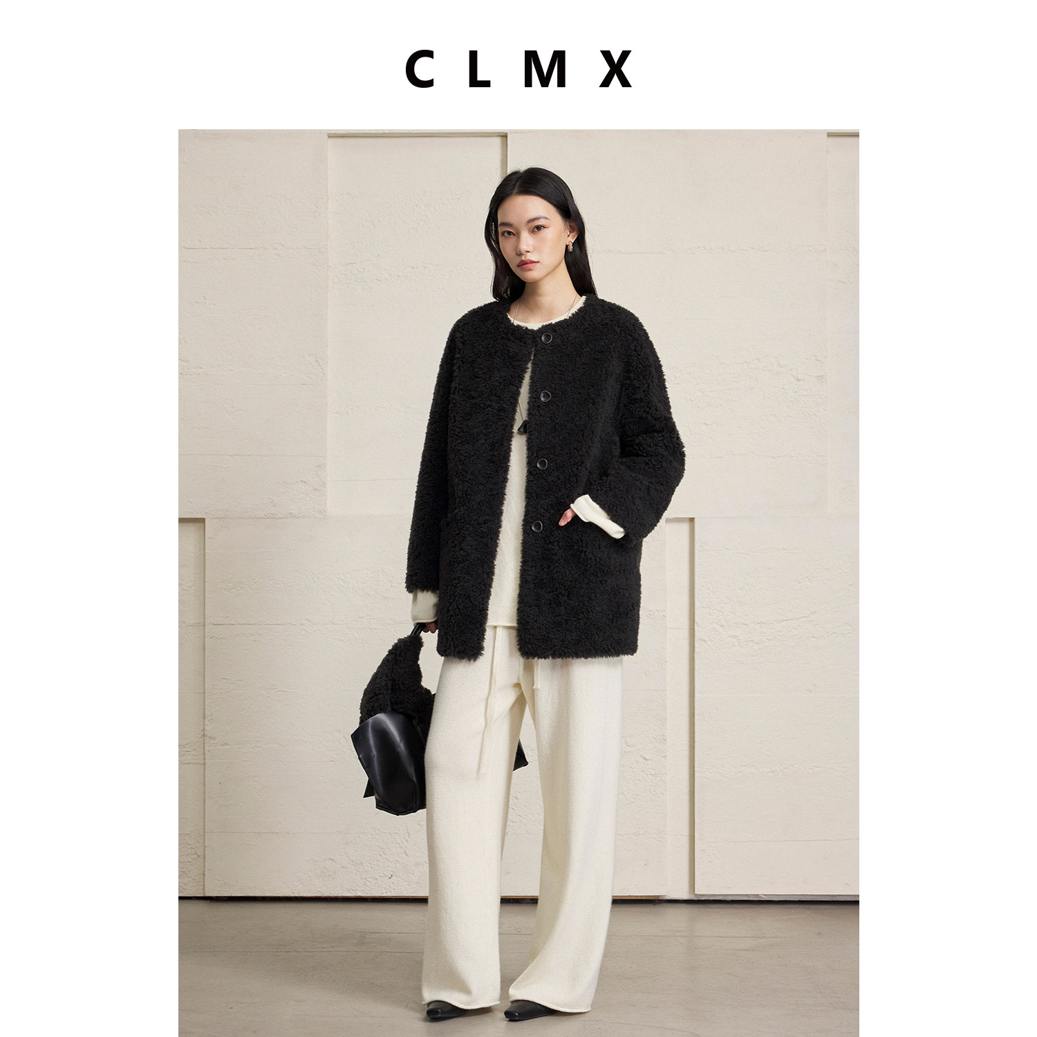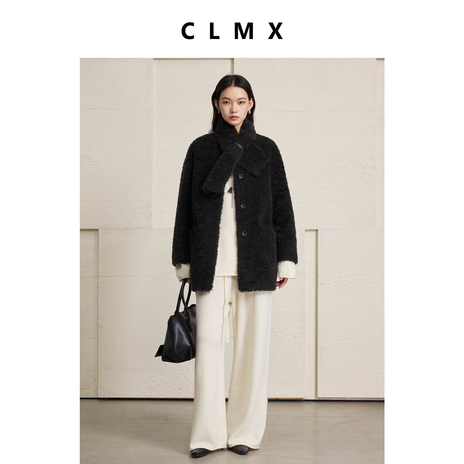 CLMX100%绵羊毛时髦宽松落肩廓形圆领外套赠围巾