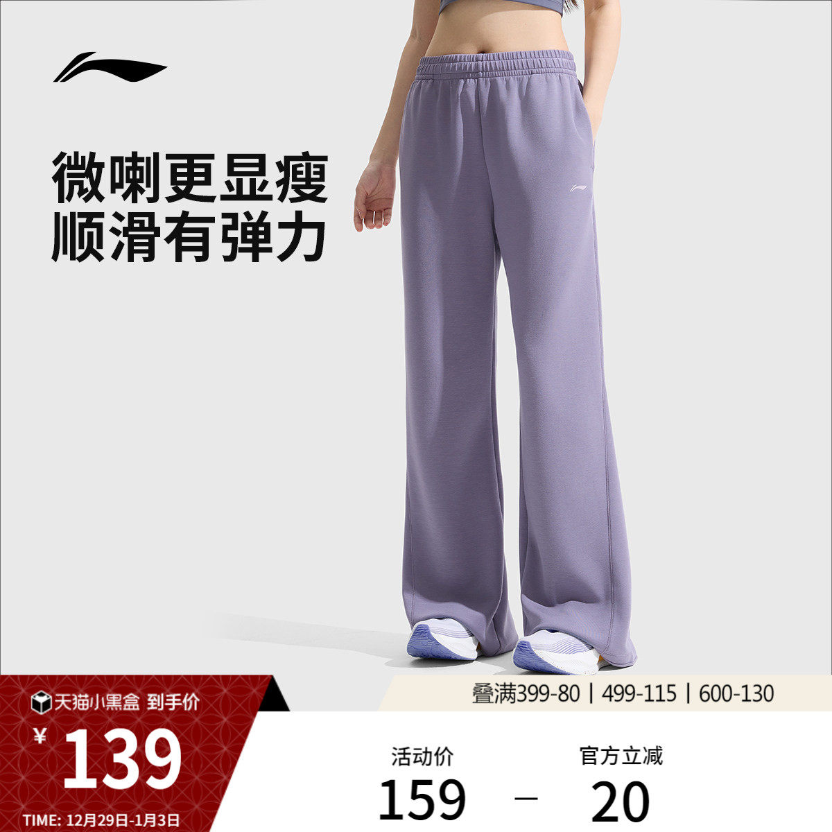 李宁奶芙裤丨阔腿裤女冬季微喇裤休闲加绒运动裤直筒黑色卫裤女款