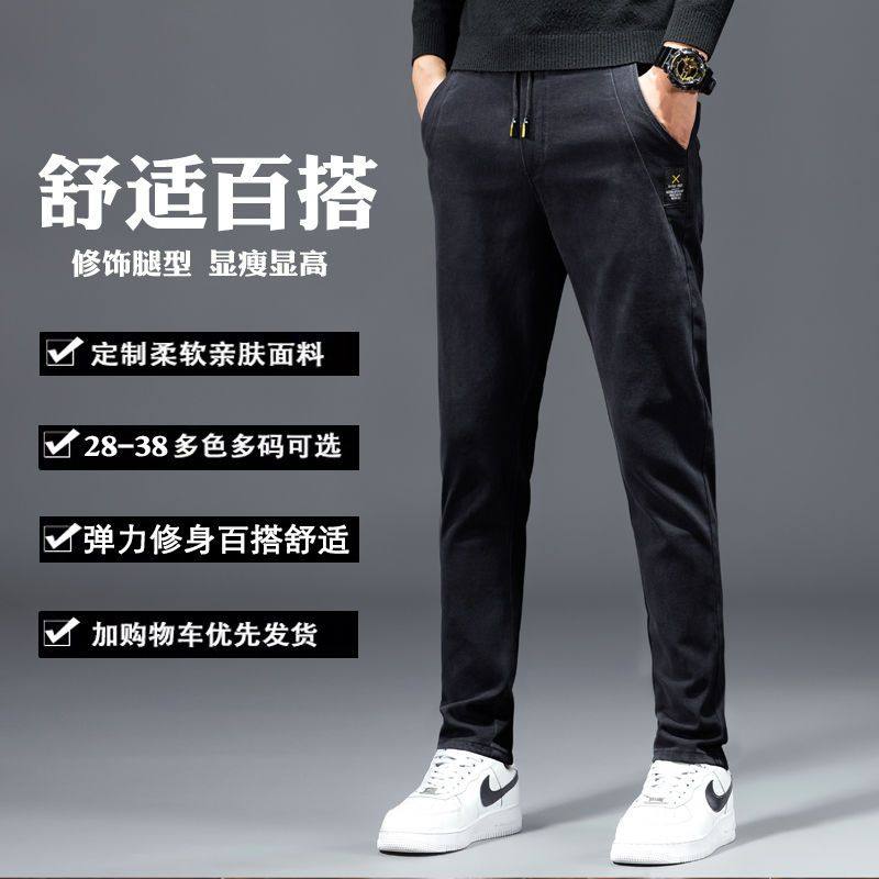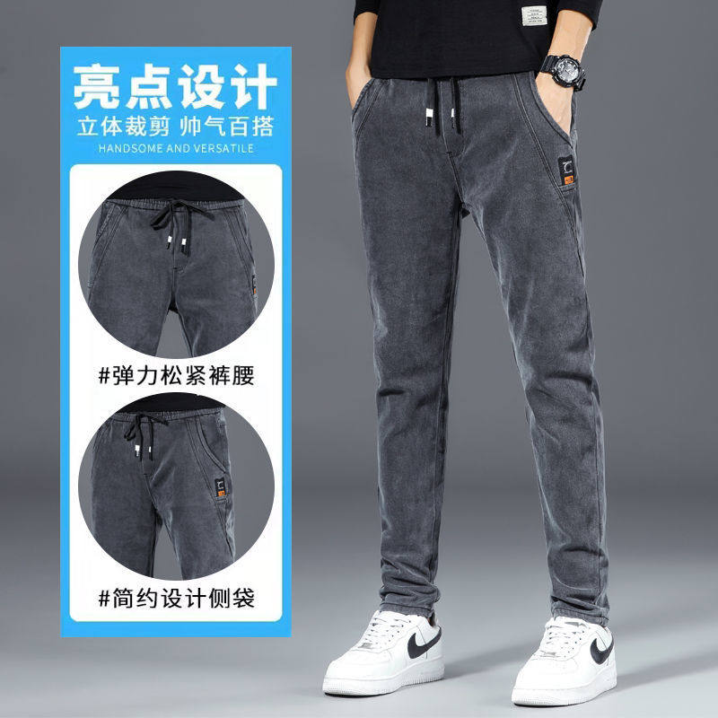 牛仔裤男款松紧腰直筒修身春秋冬季加绒加厚保暖工装休闲长裤子男