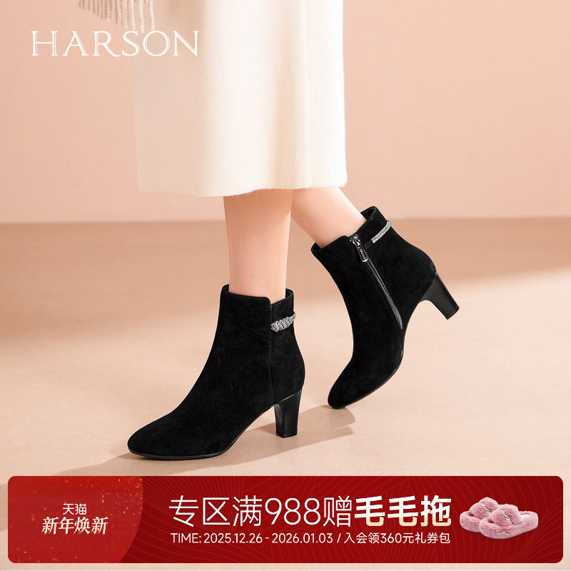 哈森气质尖头时尚经典水钻高跟时装靴短靴女2025冬新款HA257918