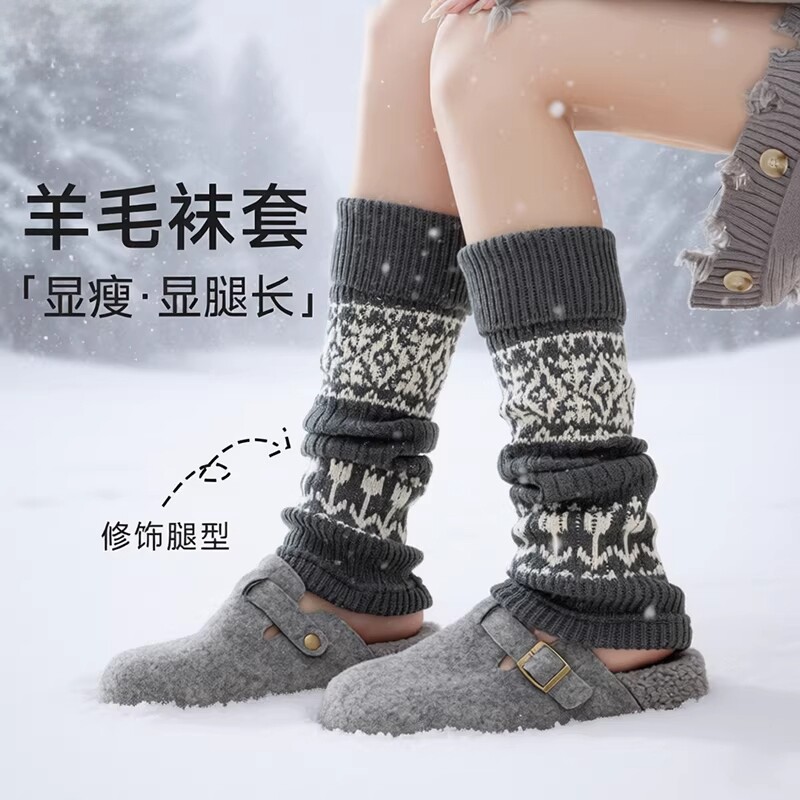 复古费尔岛女堆堆袜套秋冬款保暖配雪地靴针织羊绒加厚灰色小腿套