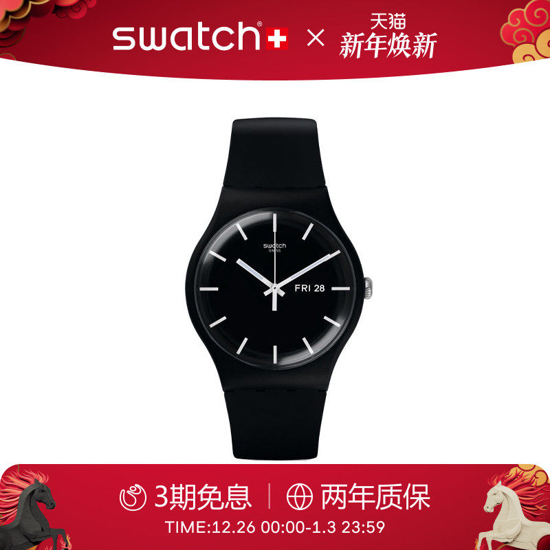 Swatch斯沃琪瑞士手表黑色夜光初高中学生日历石英腕表新年礼物
