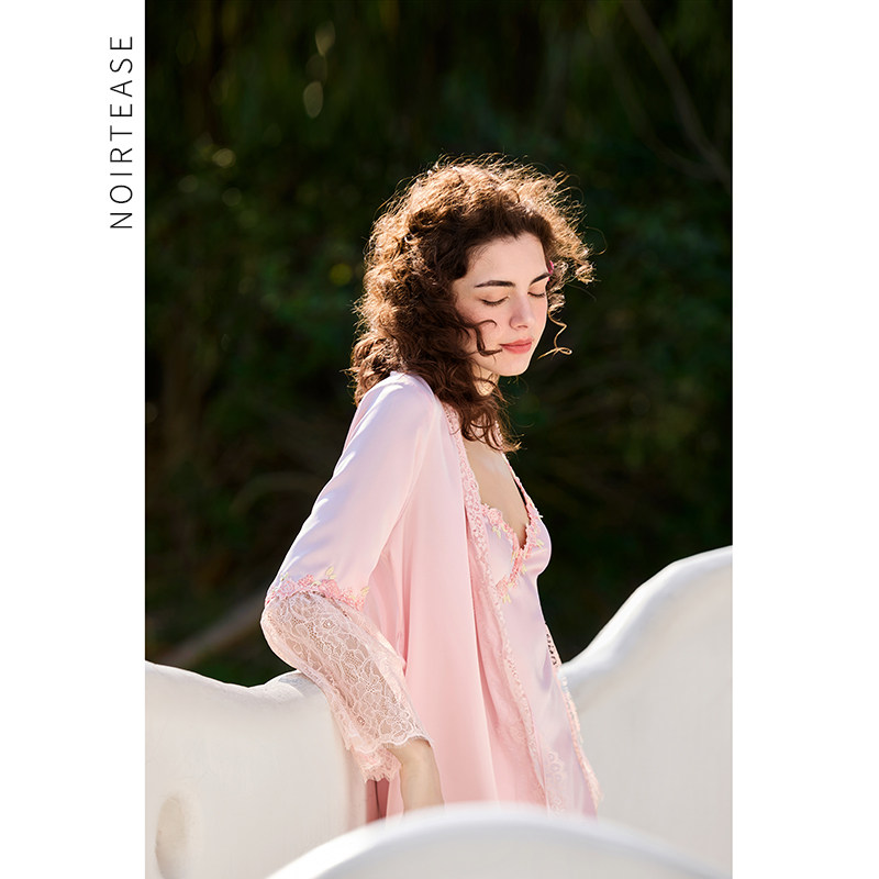 NoirTease夏季薄款丝质睡袍女士V领性感蕾丝系带纯欲风浴袍家居服