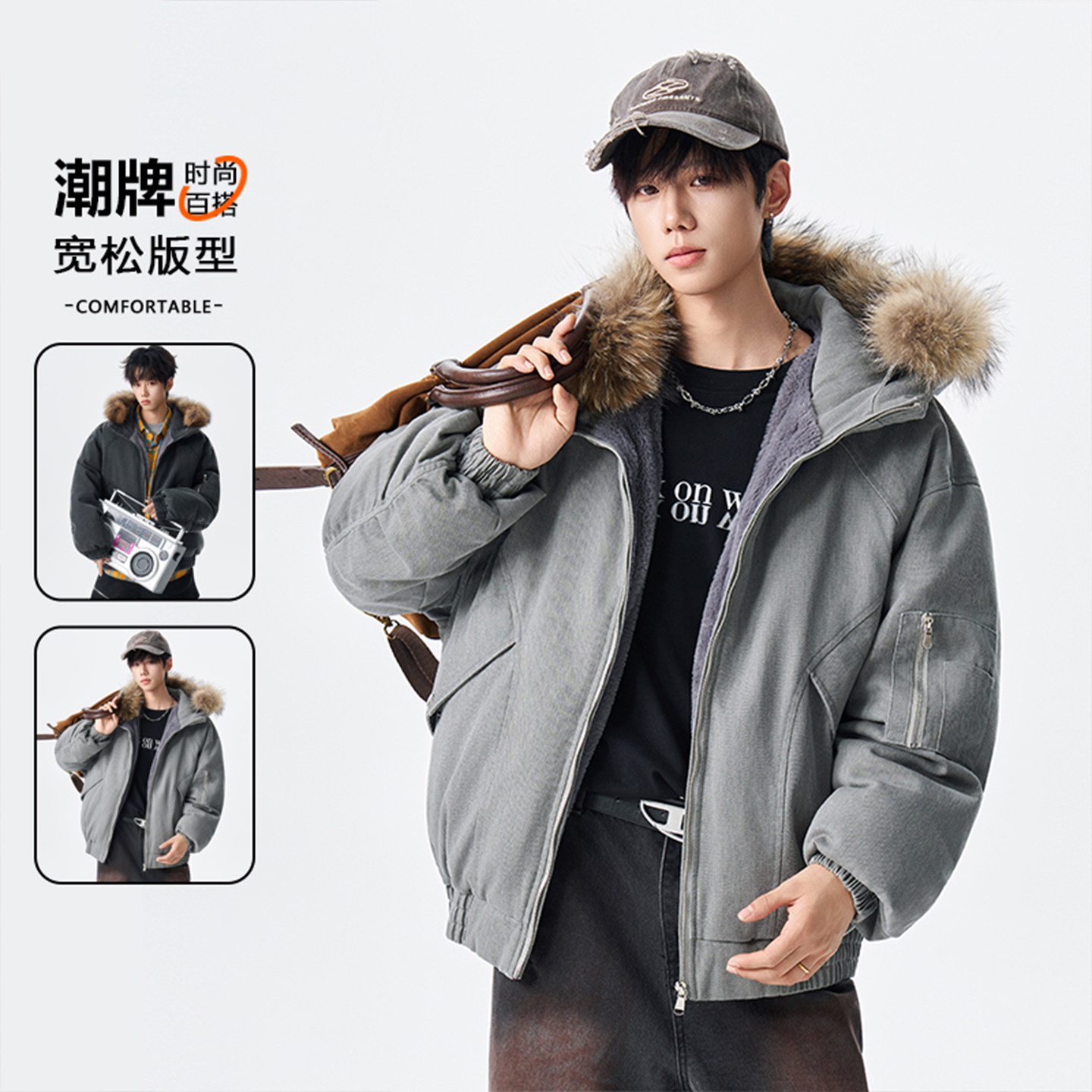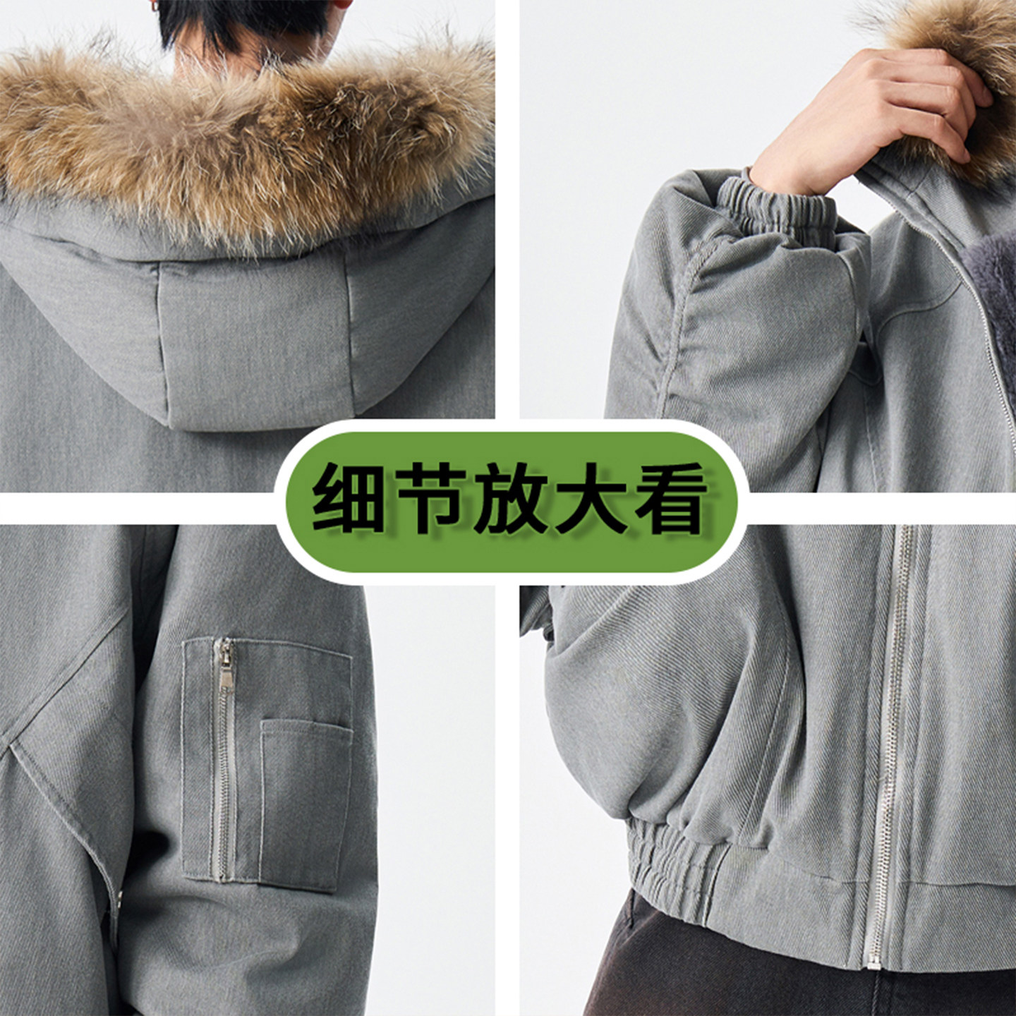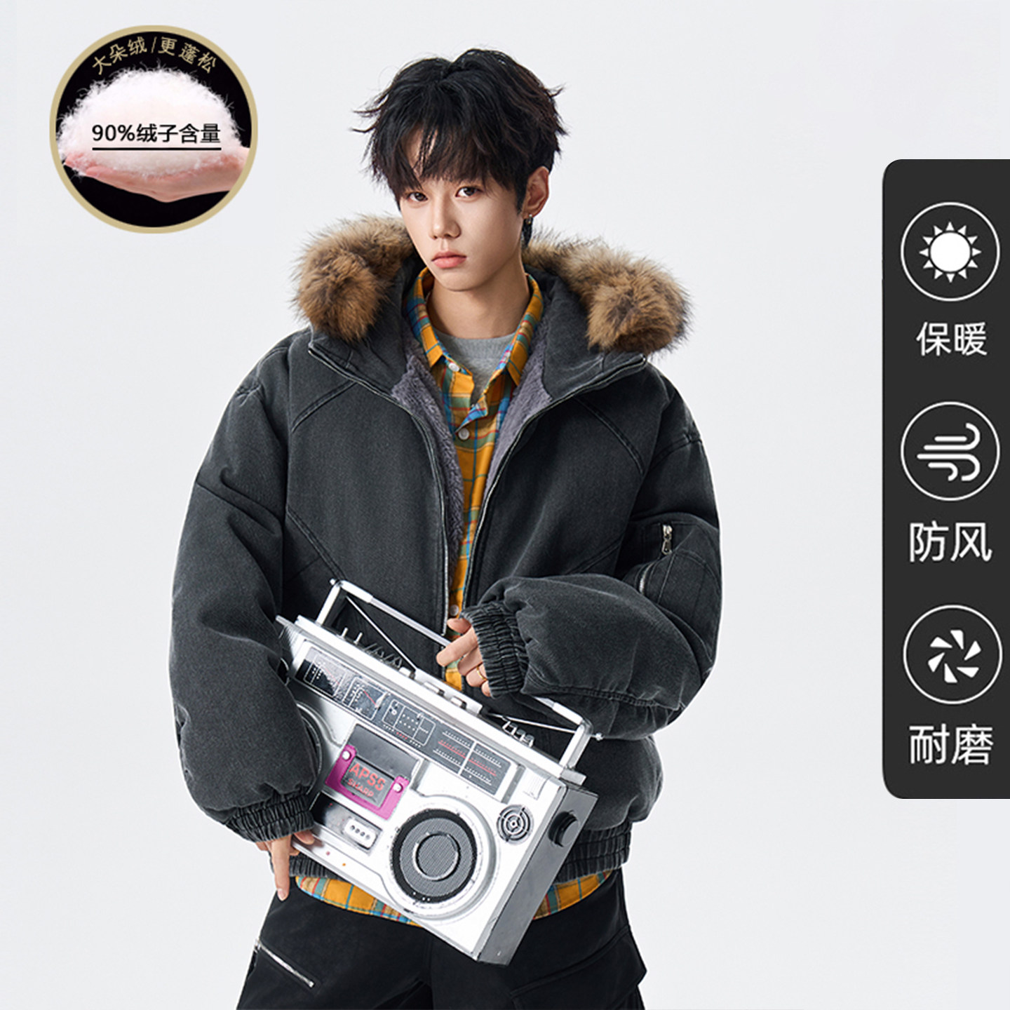 猫人轻薄羽绒服男款冬季美式复古毛领座山雕外套重磅帆布水洗夹克