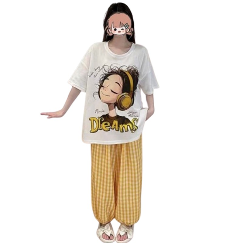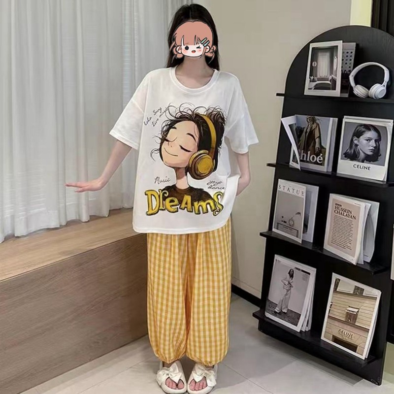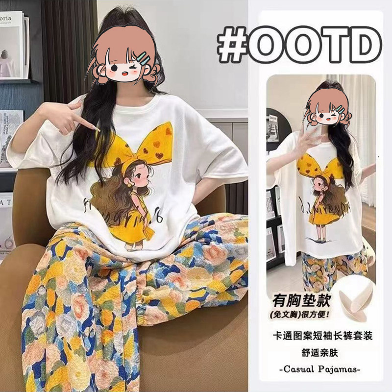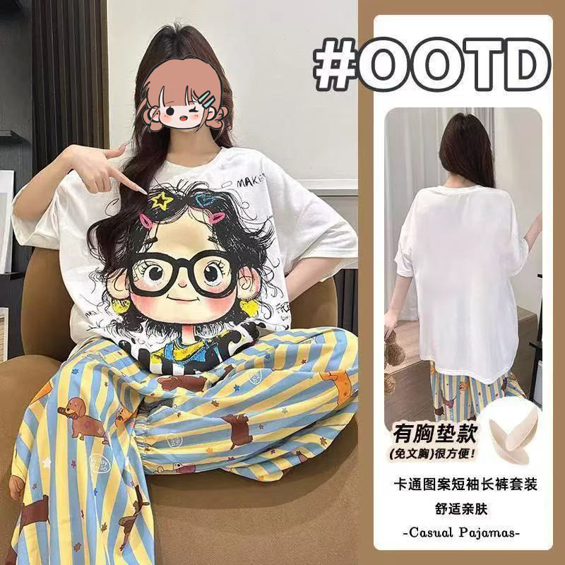 带胸垫睡衣女款2025新款夏季短袖长裤外穿卡通耳机女孩家居服套装