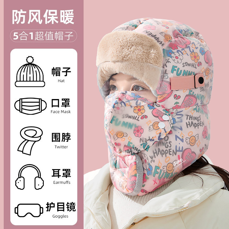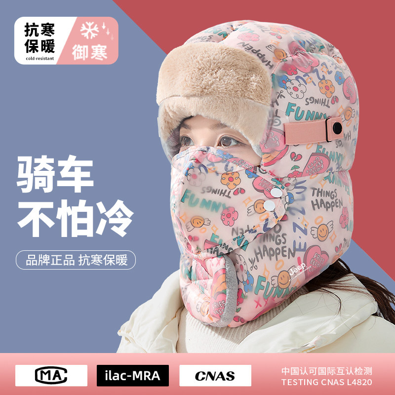 jeep吉普女士雷锋帽冬季加绒加厚骑电动车保暖帽子女防风骑行面罩