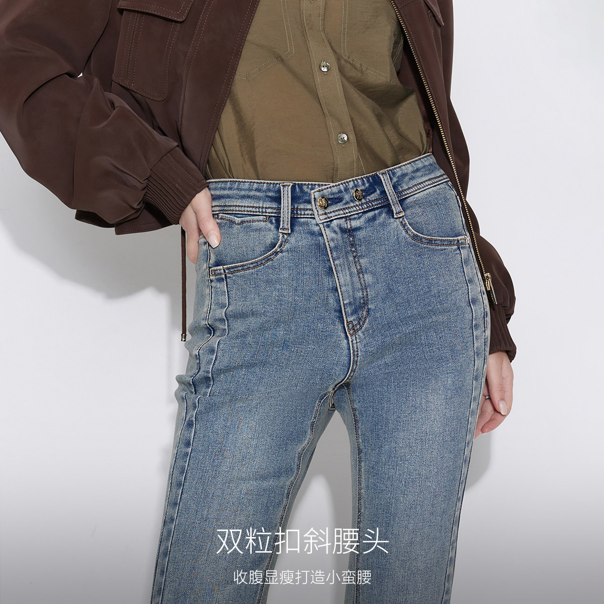 个性斜裁门襟,喇叭裤脚拉长比例