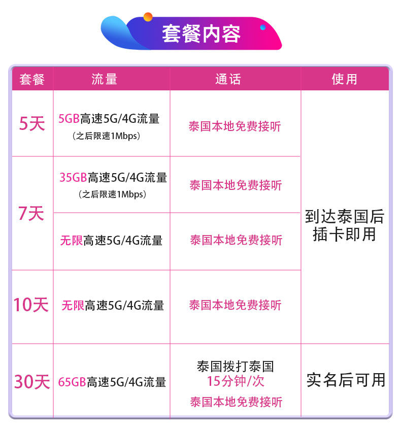 泰国原装进口 送卡针 送转换插头 5G网络 插卡即用 可选7/10天无限流量 信号全泰国覆盖