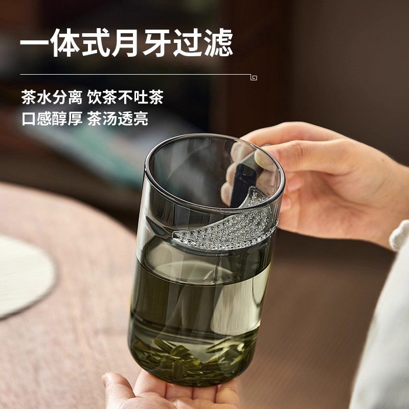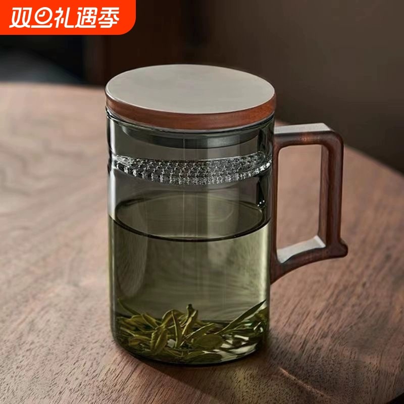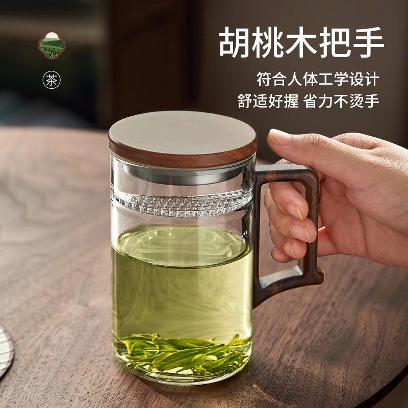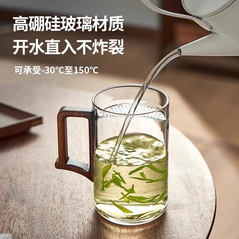 高颜值月牙过滤杯木把玻璃高硼硅耐热玻璃茶杯分离泡茶器办公室