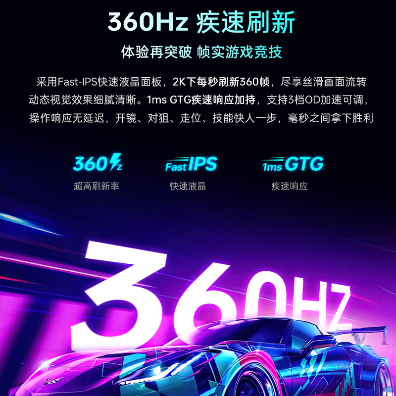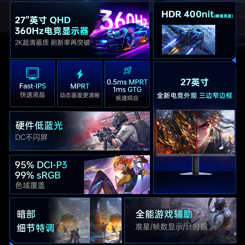雷神显示器27英寸2K360Hz高刷电竞升降旋转外接电脑屏幕JQ27F360L