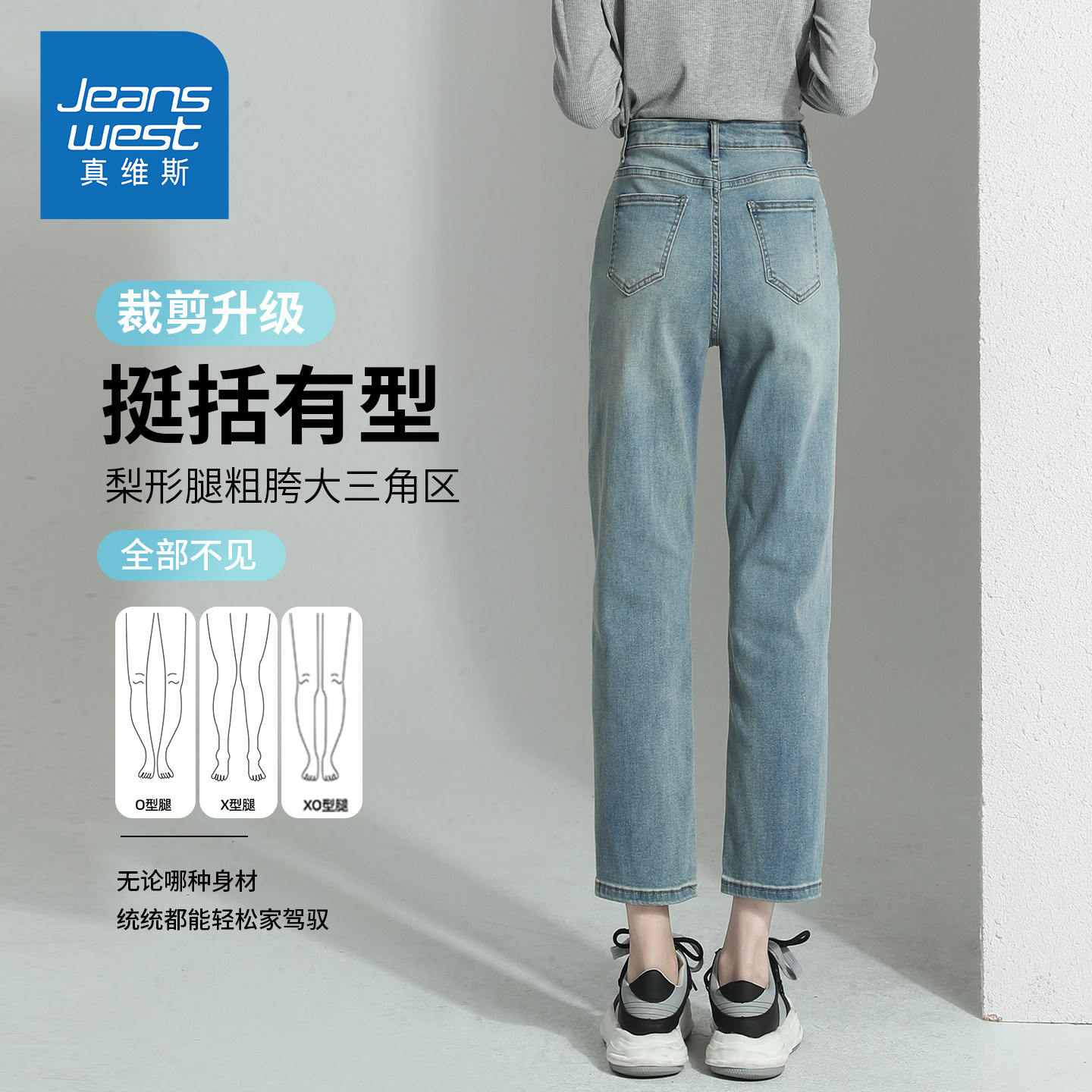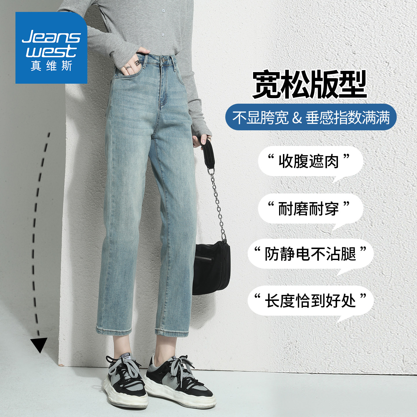 KZH真维斯九分牛仔裤女秋冬新款宽松直筒裤加绒小个子高腰哈伦裤