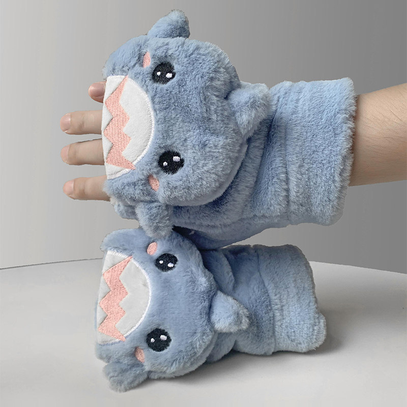 可爱小鲨鱼手套女冬季半指翻盖情侣加厚加绒学生防寒保暖骑行毛绒