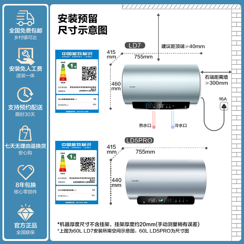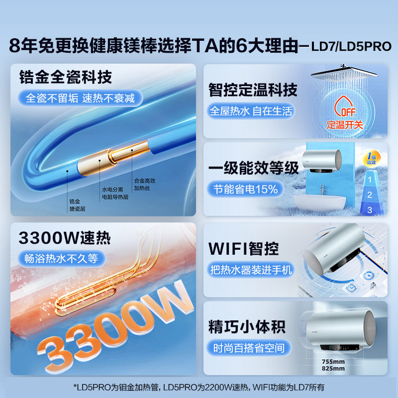 海尔出品统帅家用电热水器节能洗澡60L一级能效镁棒免换官方LD7