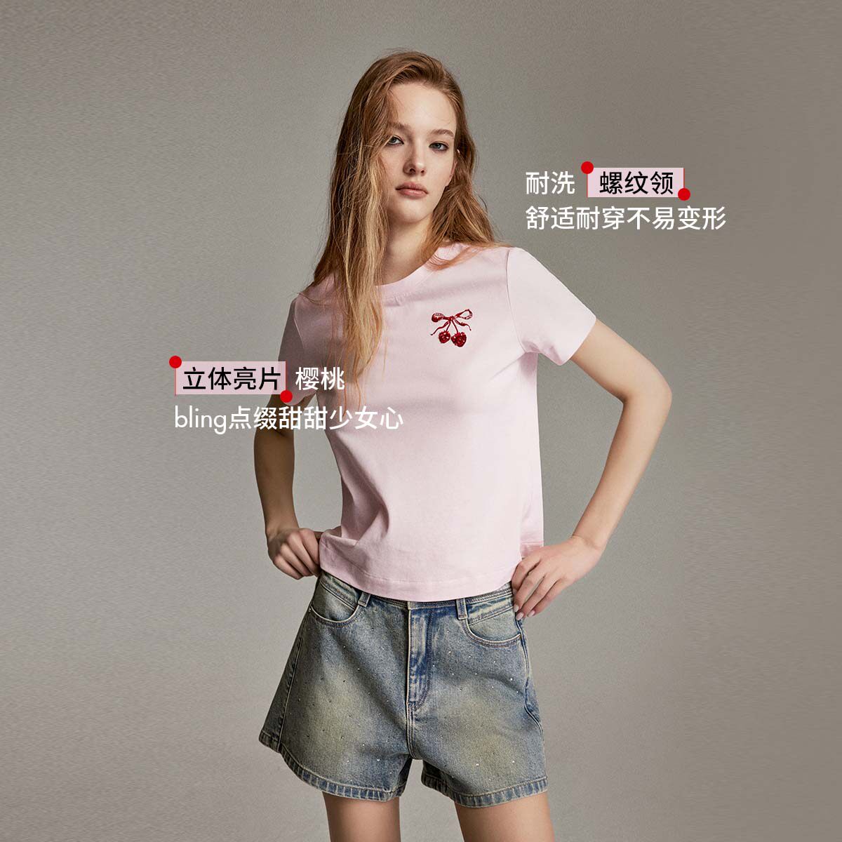 ONLY2026春季新款纯棉甜美舒适重工立体亮片水果短款正肩T恤女