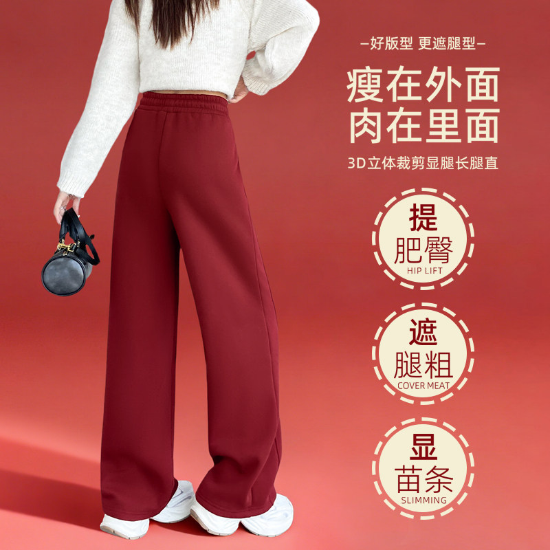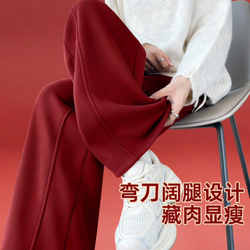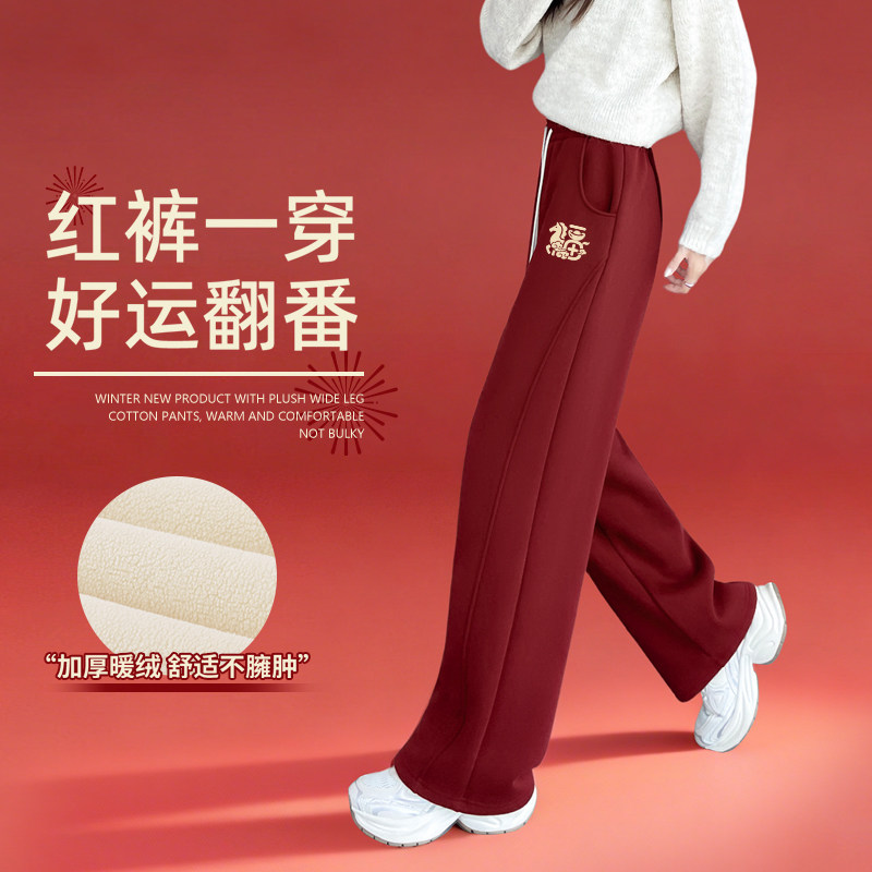 雪中飞红色裤子女2026新款加绒加厚运动裤学生新年本命年阔腿裤PC
