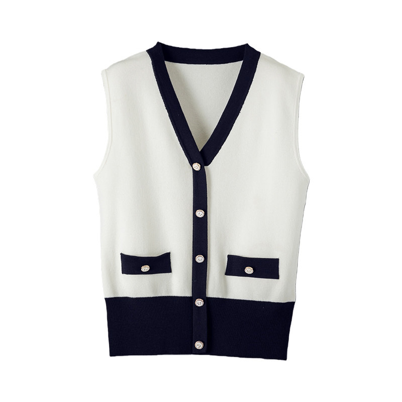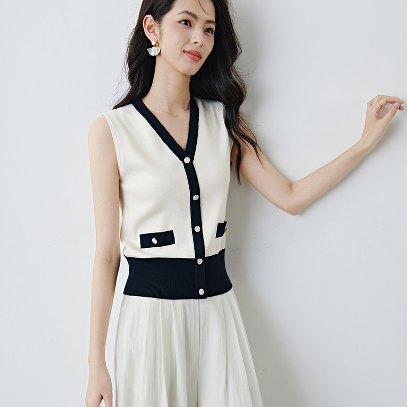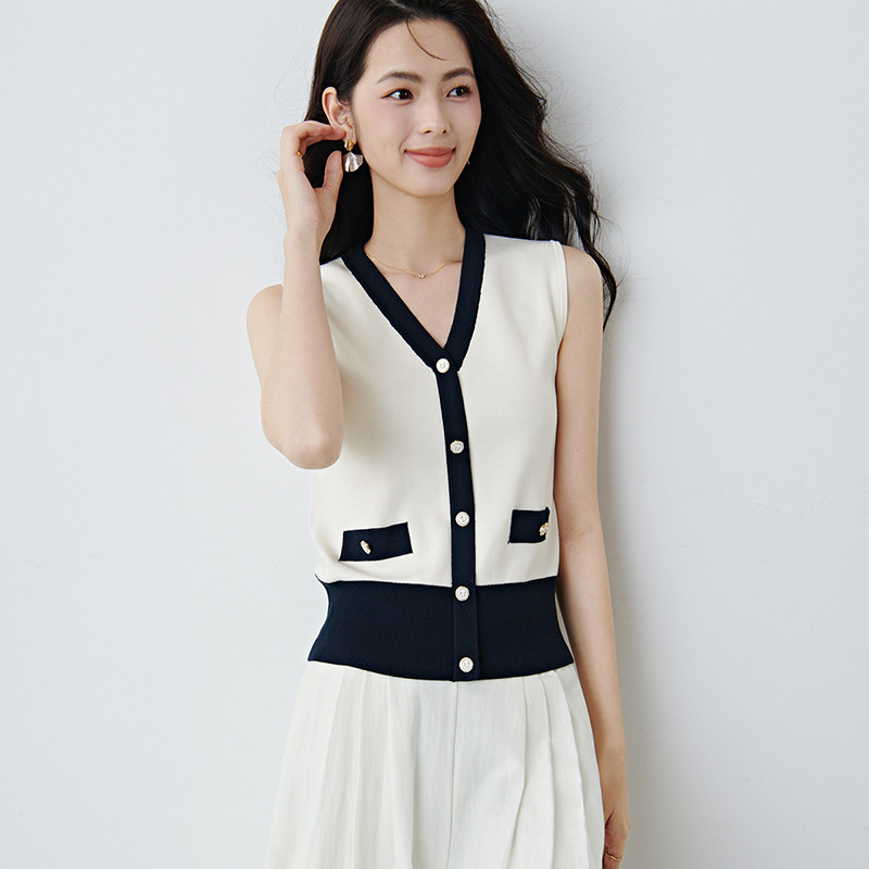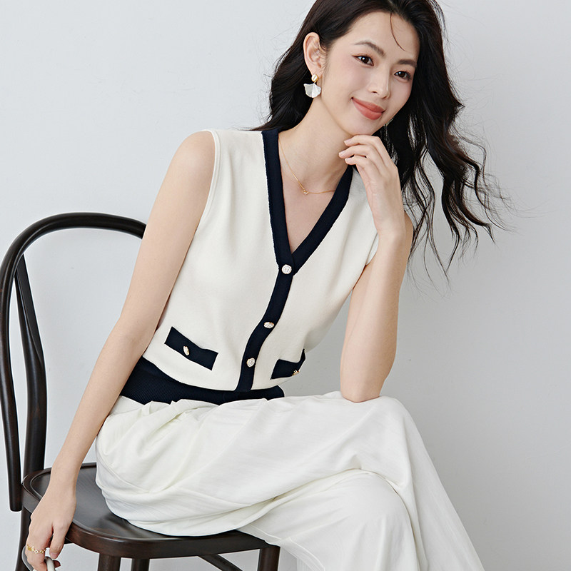 晚白2026年春新款时尚撞色V领上衣亲肤舒适单穿内搭无袖针织衫
