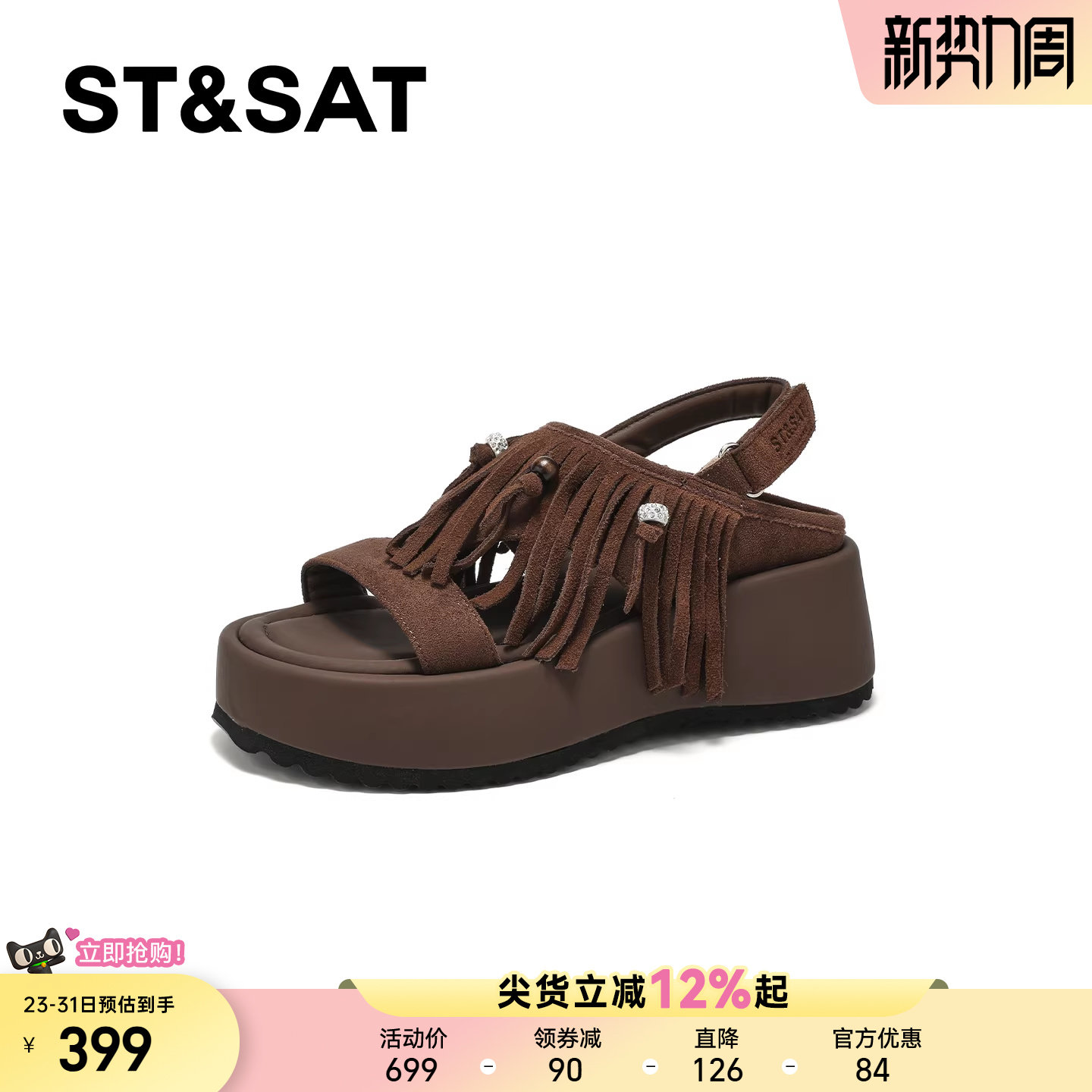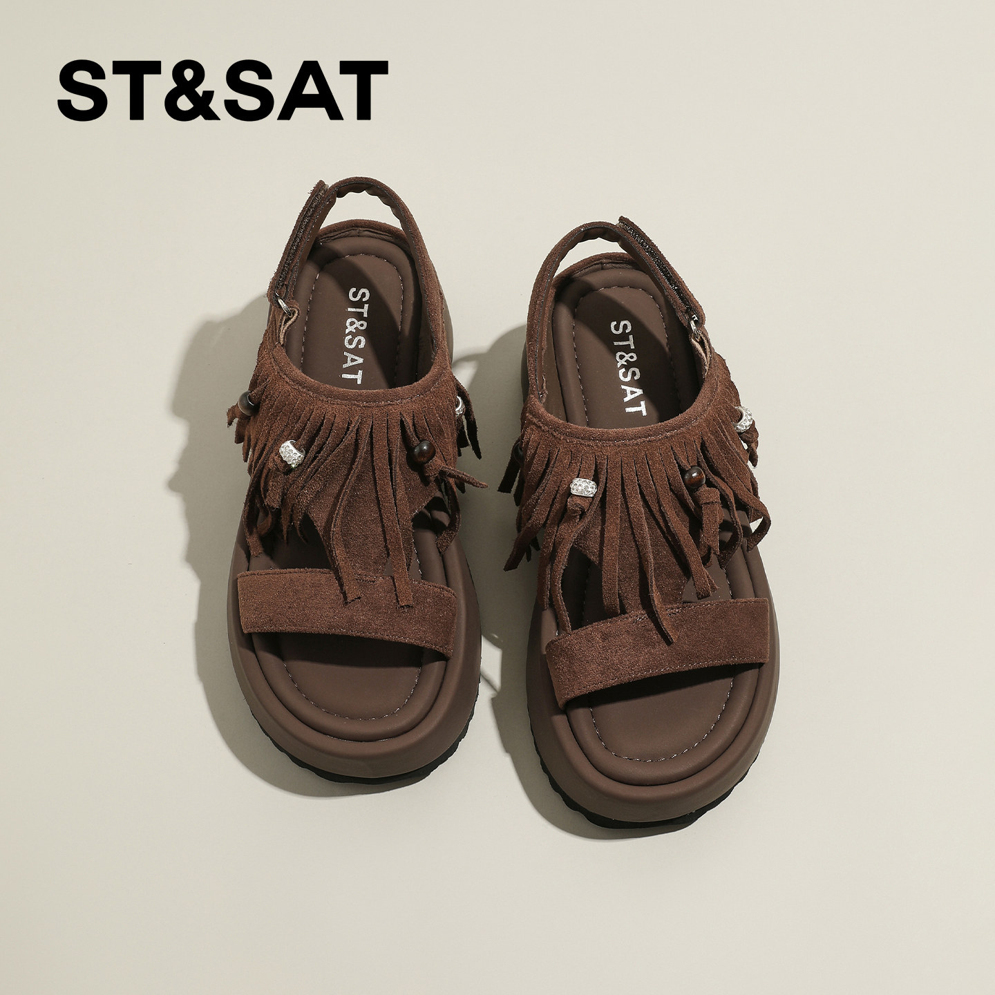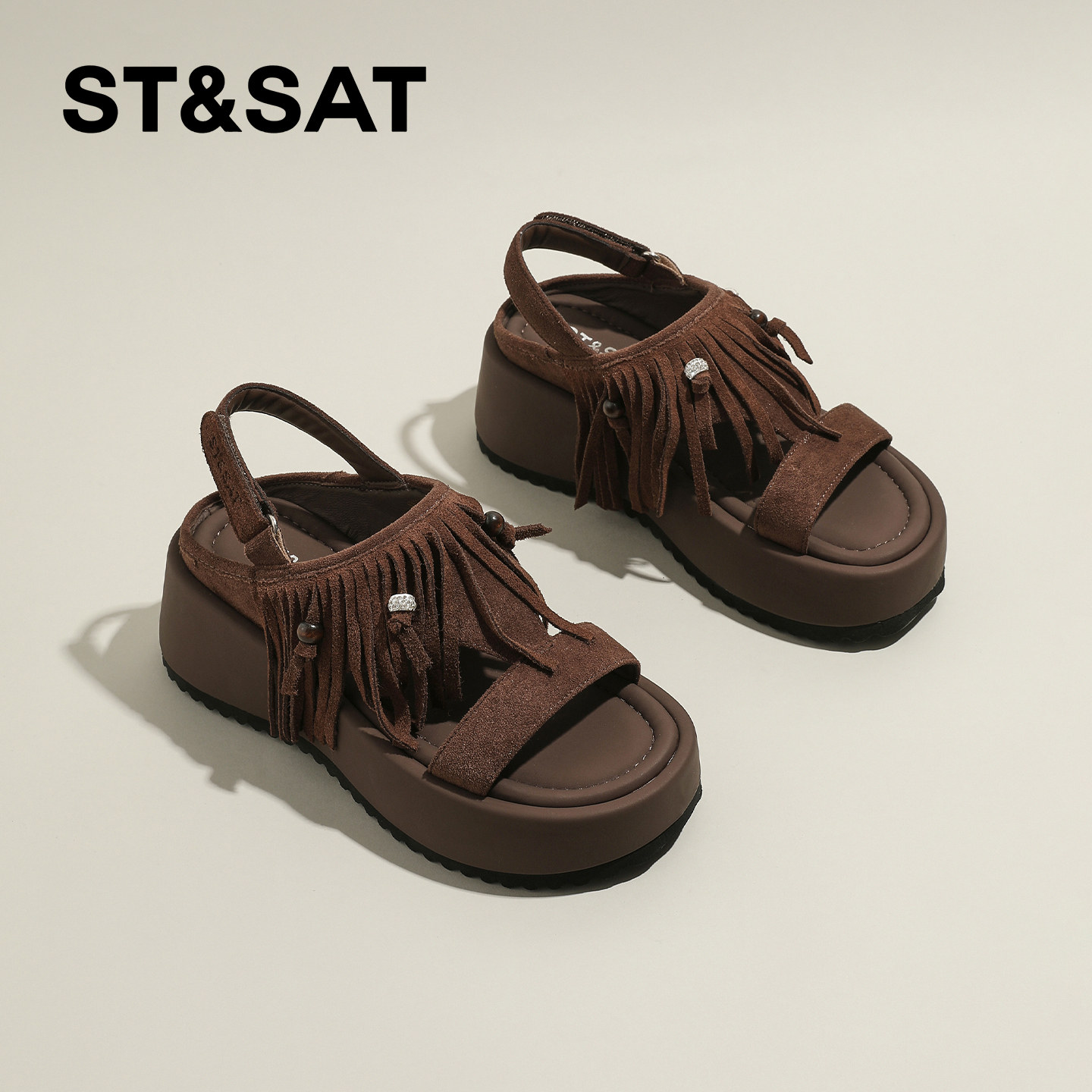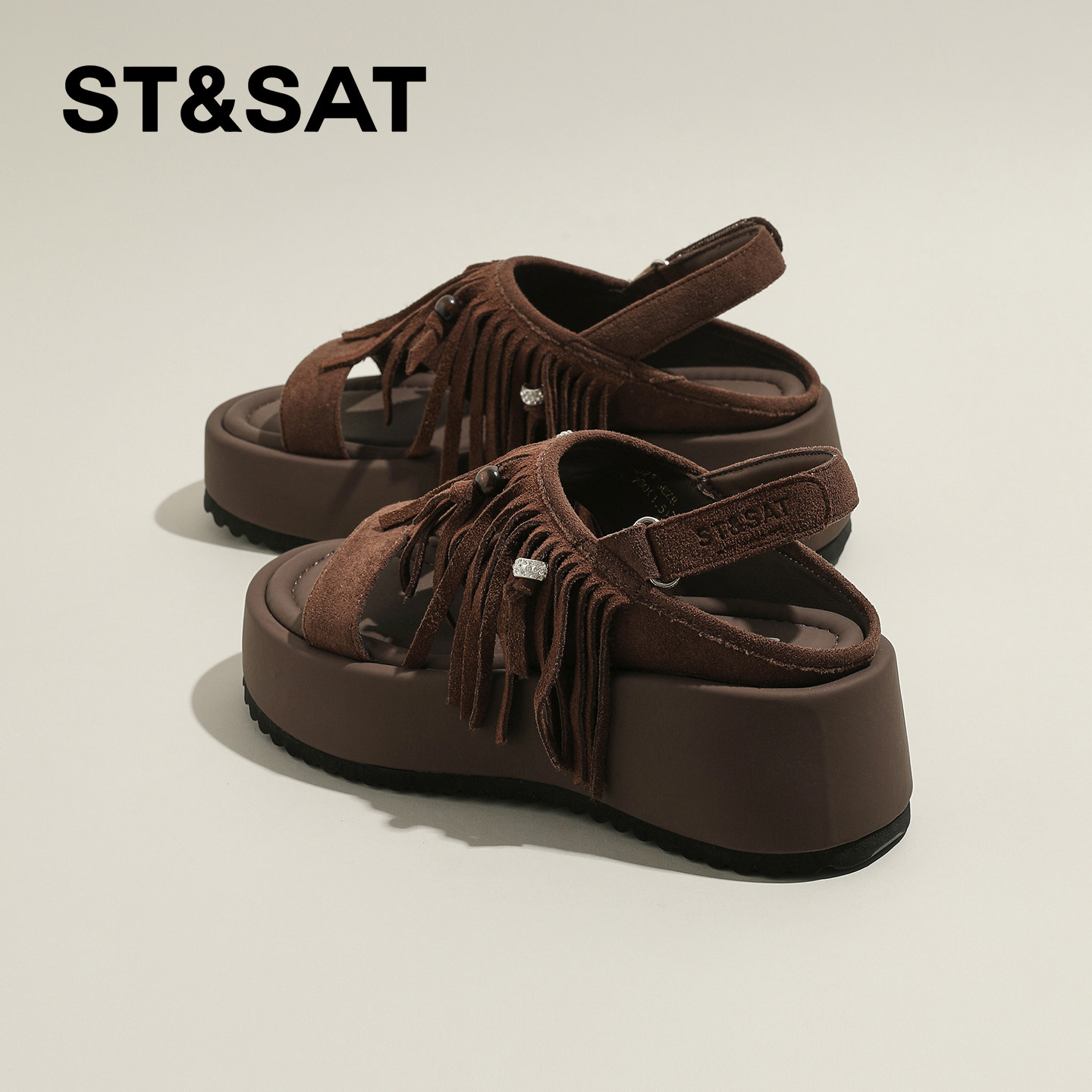 星期六小众流苏坡跟凉鞋女款新款软底松糕鞋百搭铆钉罗马凉鞋