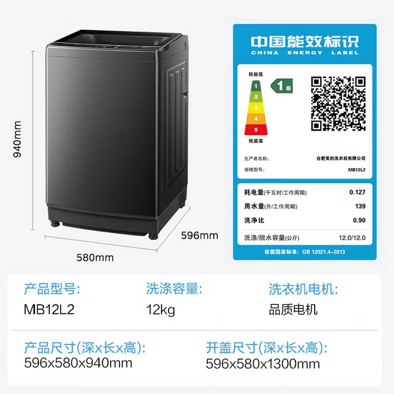 美的12公斤一级能效宿舍租房波轮洗衣机内筒免清洗抗菌除螨洗涤
