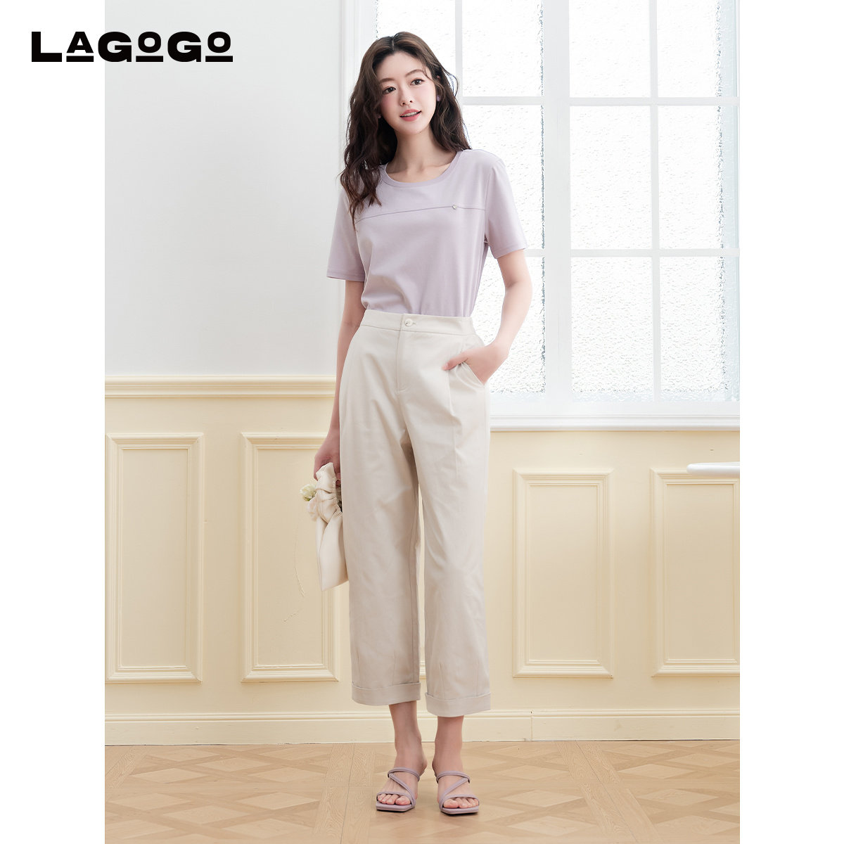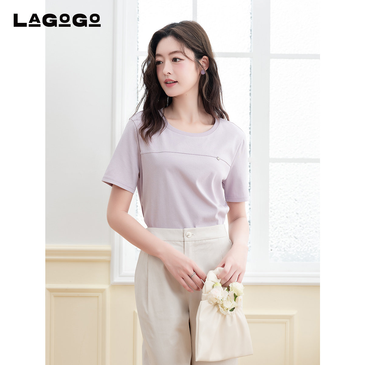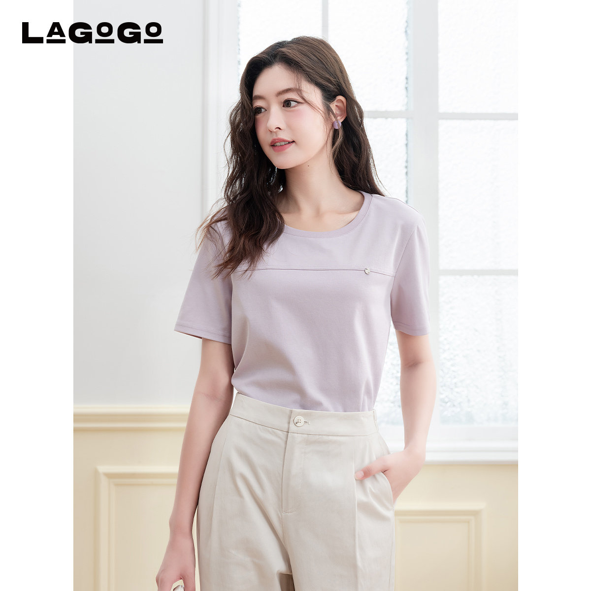 LAGOGO紫色显白圆领T恤女拉谷谷2025年夏季新款简约休闲通勤短袖