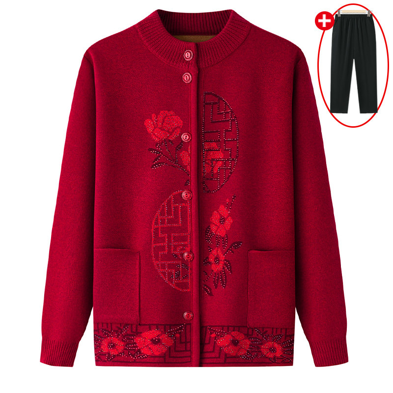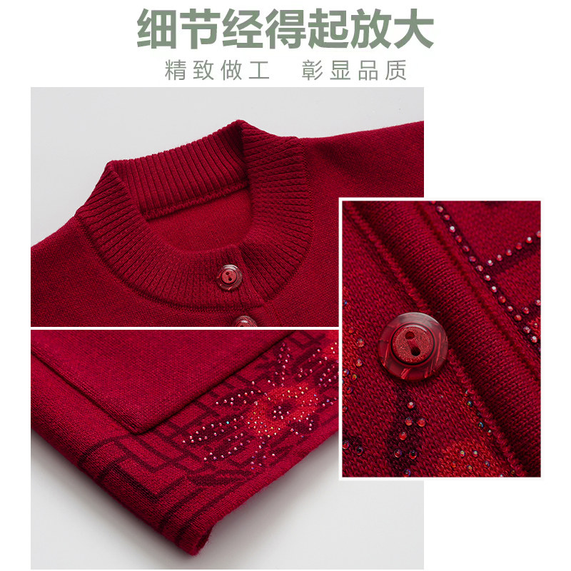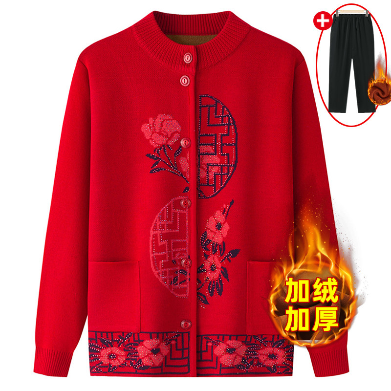 中老年人秋冬针织外套毛衣加绒加厚妈妈开衫新中式保暖女红色上衣