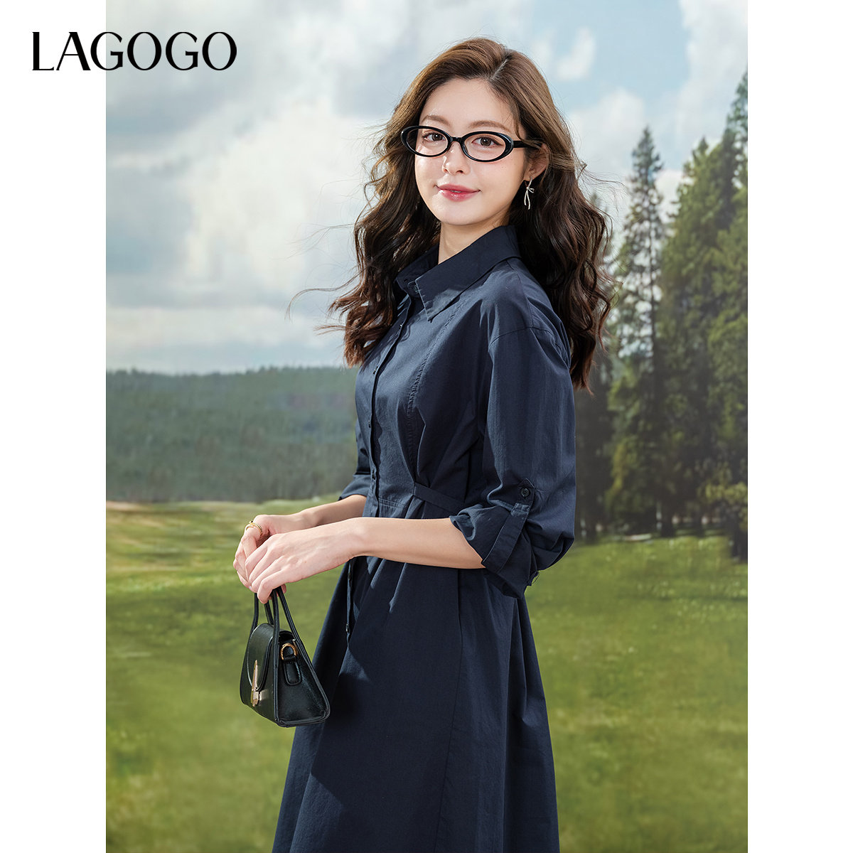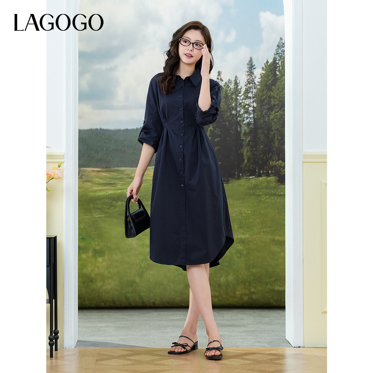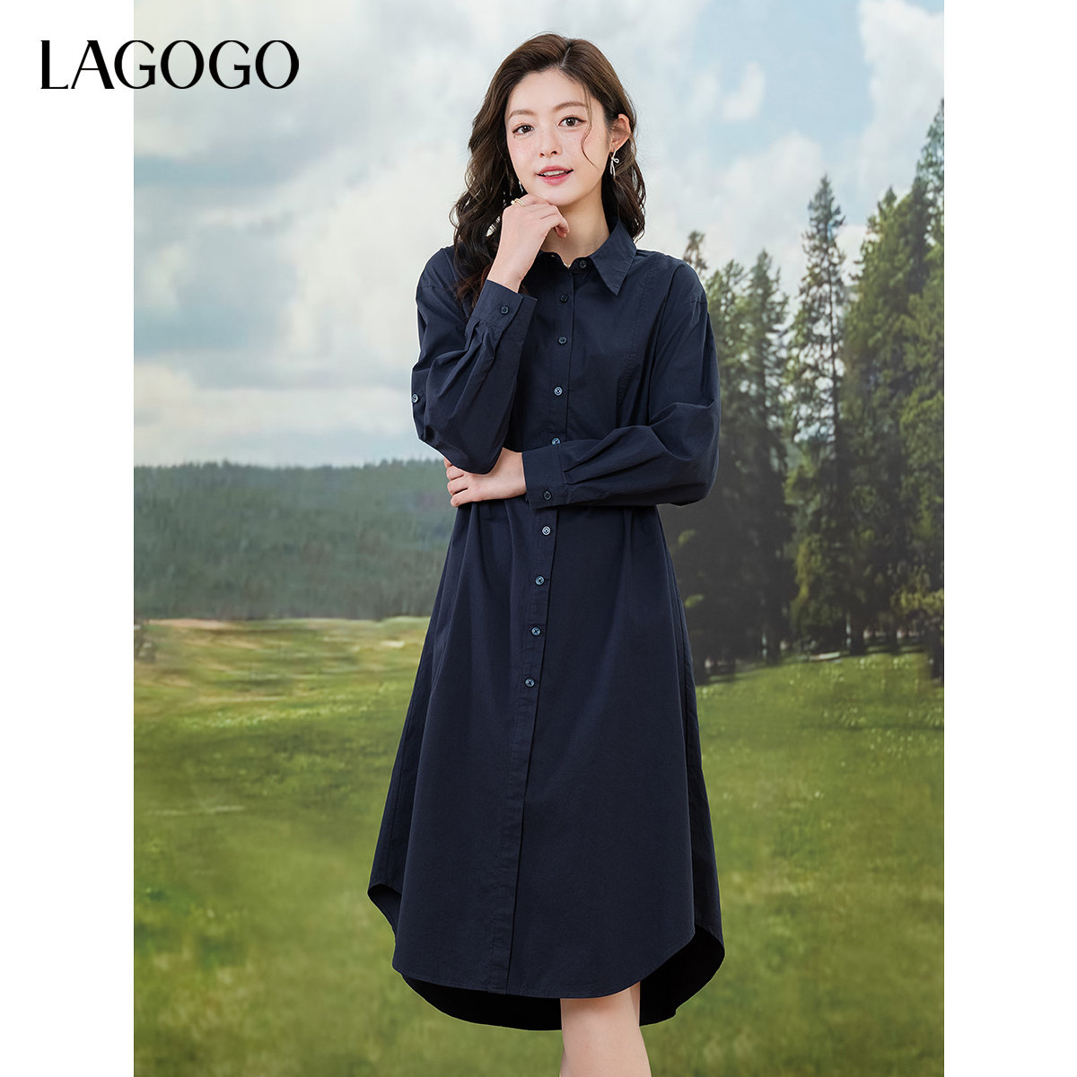 LAGOGO纯棉简约连衣裙女拉谷谷2025年夏新款系带裙子OALL433B52