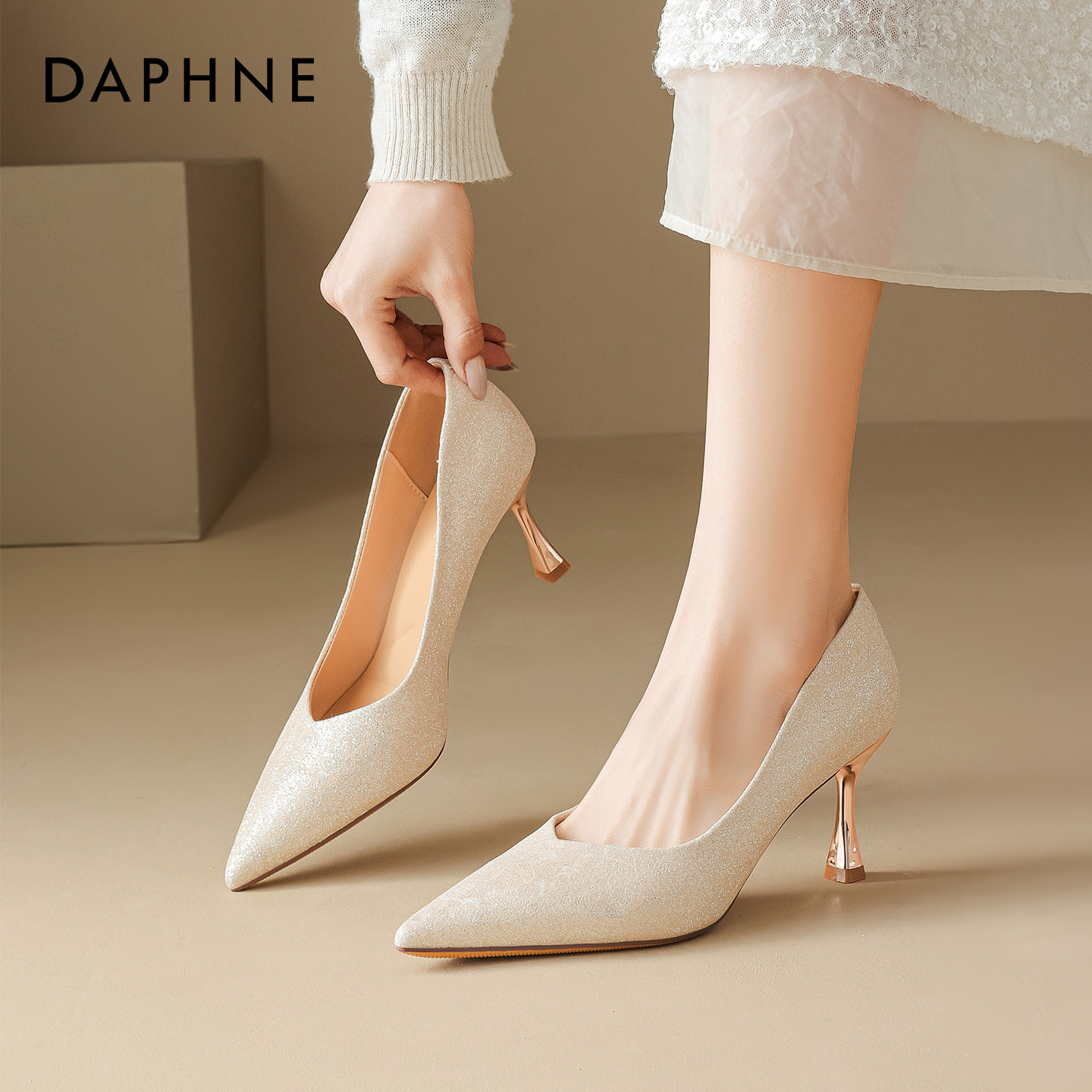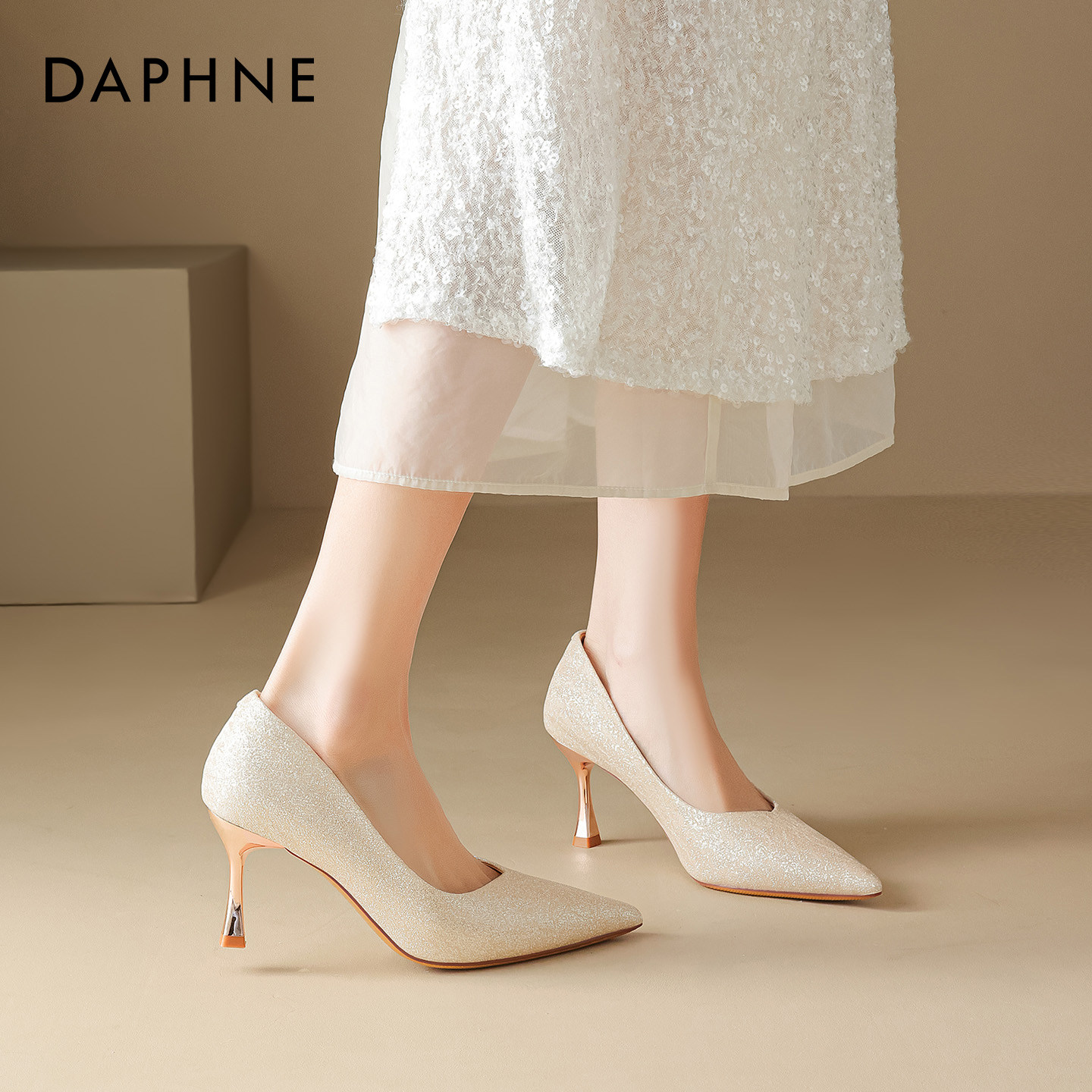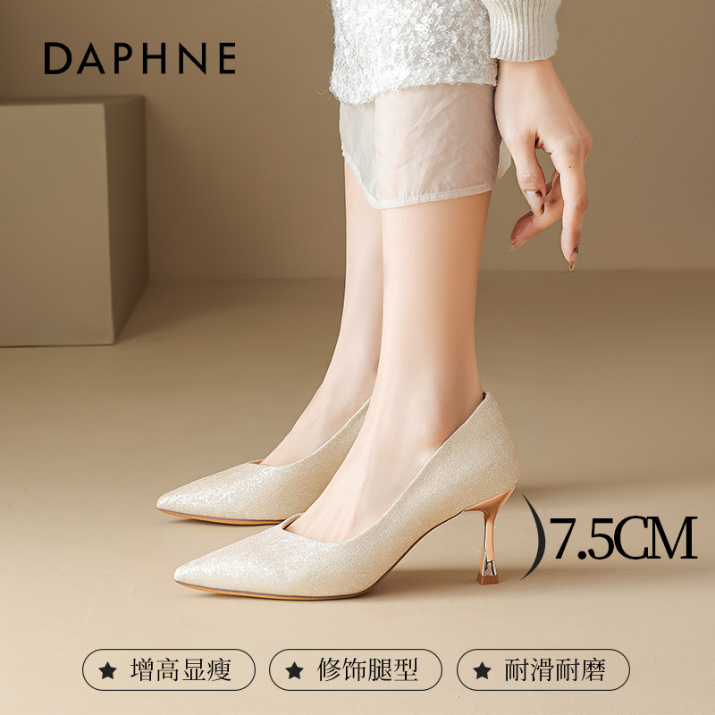 达芙妮高跟鞋婚鞋女2026新款香槟色水晶绝美单鞋尖头细跟新娘鞋子