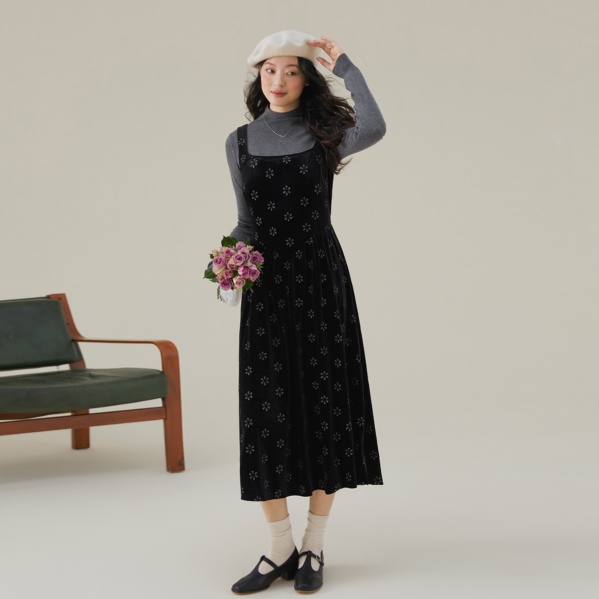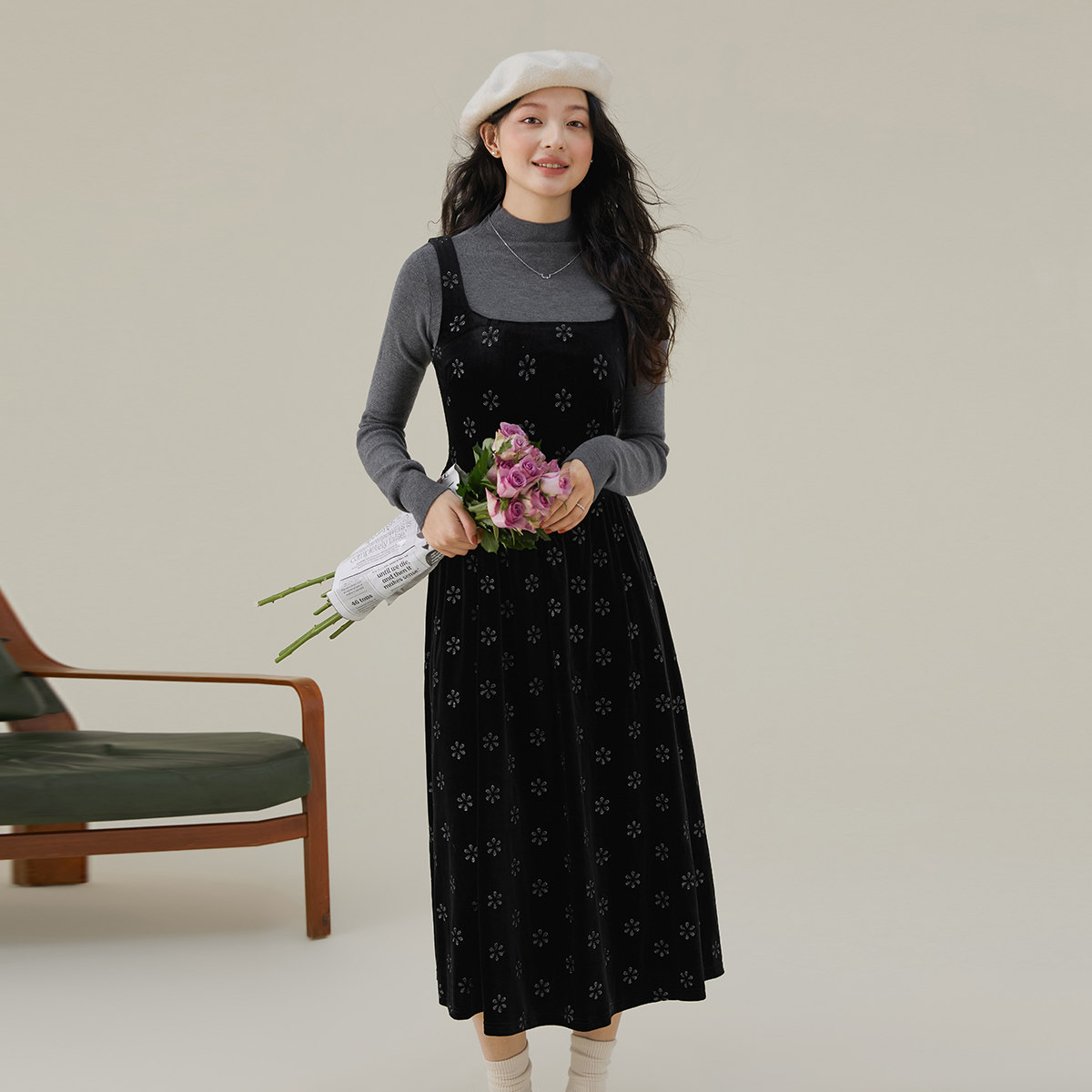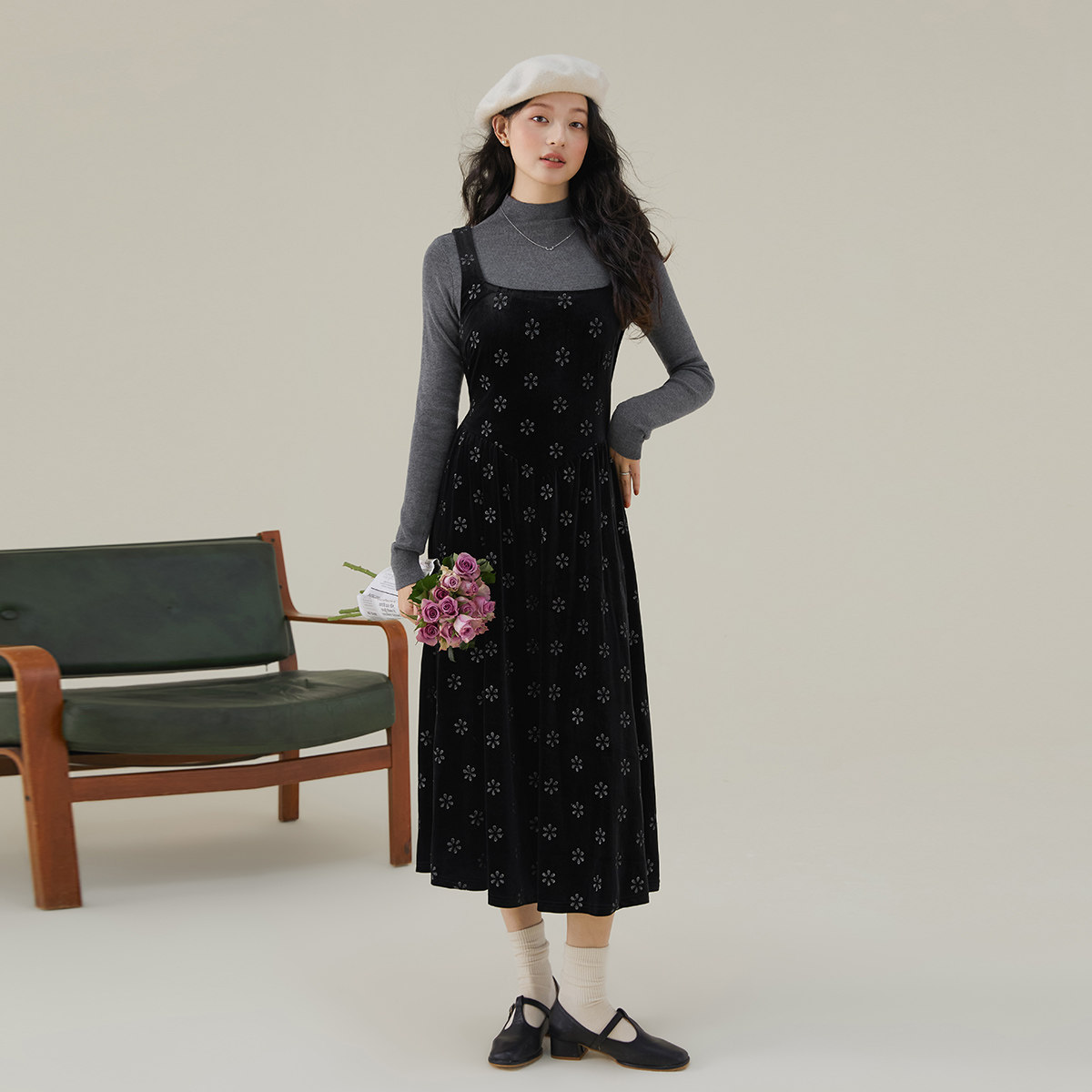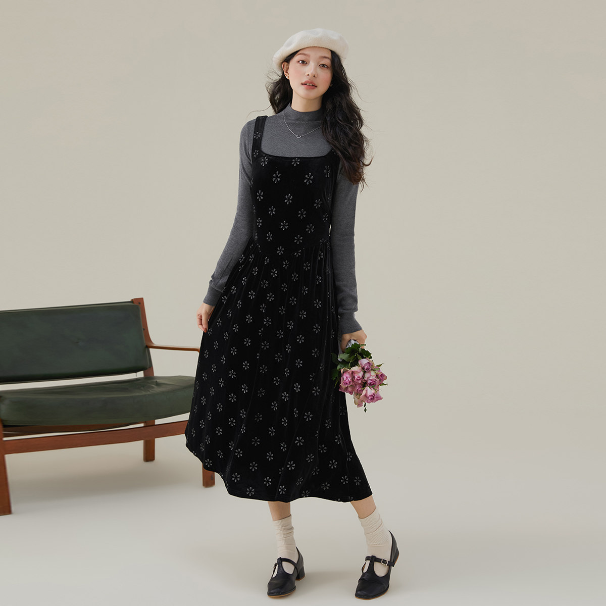 one more复古印花背带裙女2025秋冬外穿高级感连衣裙收腰法式裙子
