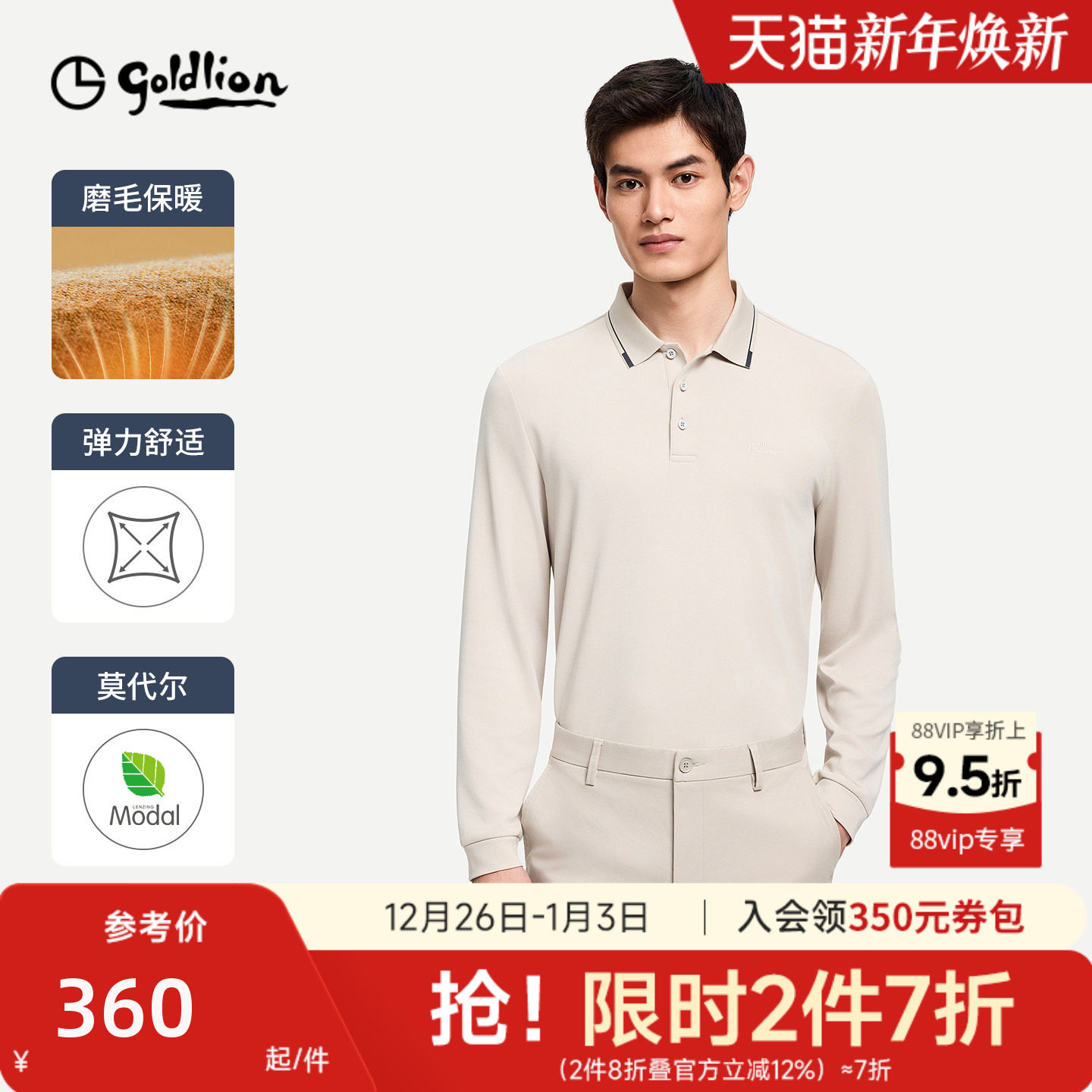 【底磨毛】金利来秋冬新款保暖弹力polo衫舒适翻领休闲长袖T恤男