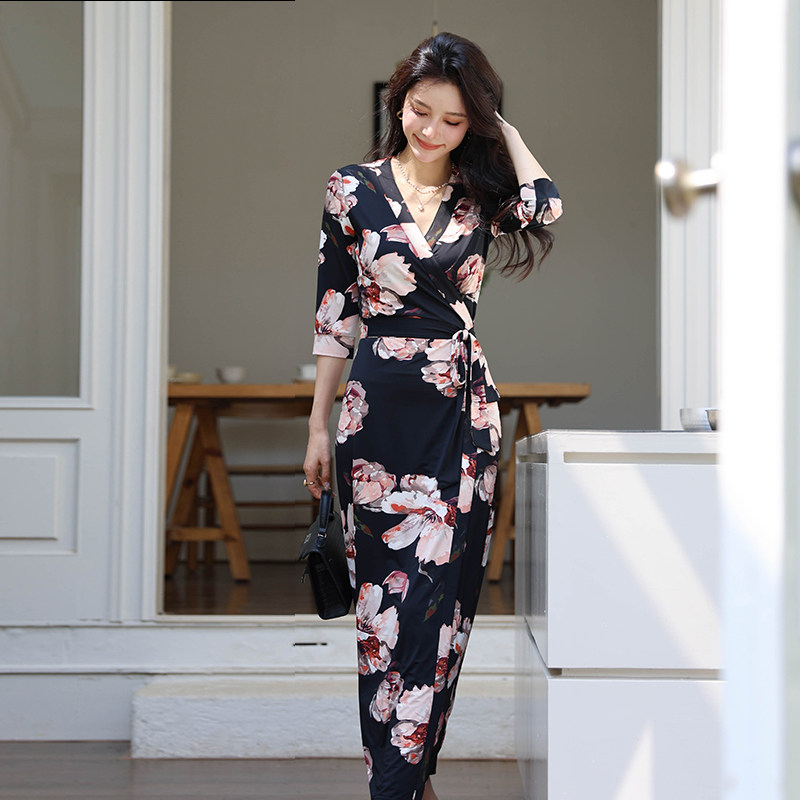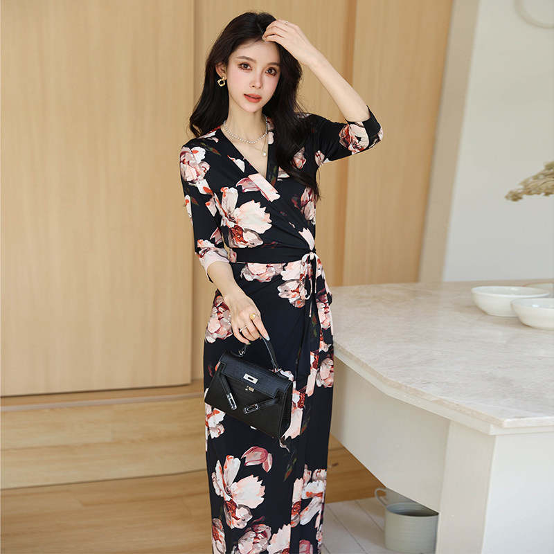 新款法式裹身裙黑底印花弹力气质修身收腰高级感显瘦一片式连衣裙