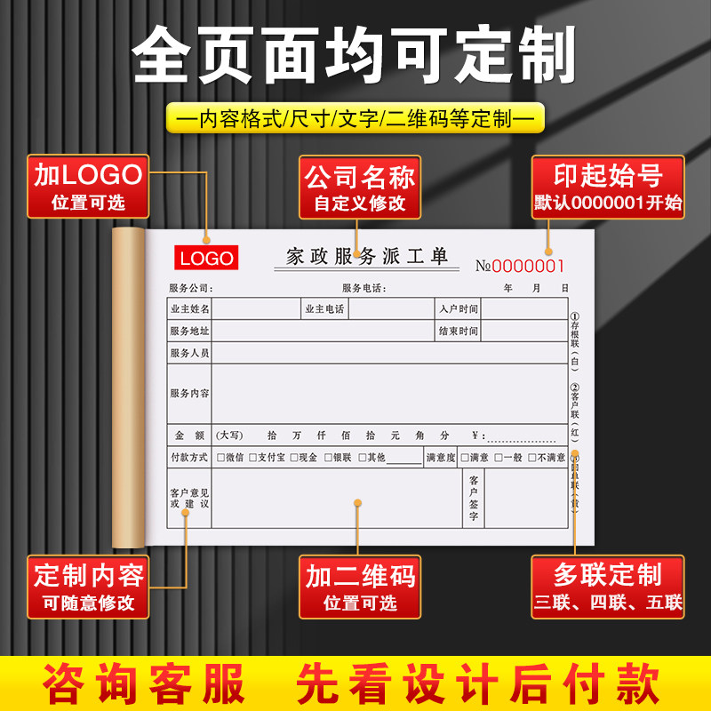【家政专用】家政服务单二联保洁记录本上门清洗合同表三联钟点工派单收据用工清洁单子客户护理派遣派工单据