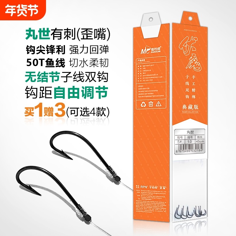 丸世鱼钩正品子线双钩绑好长柄有倒刺鱼钩鱼线组合超硬锋利钓鱼钩