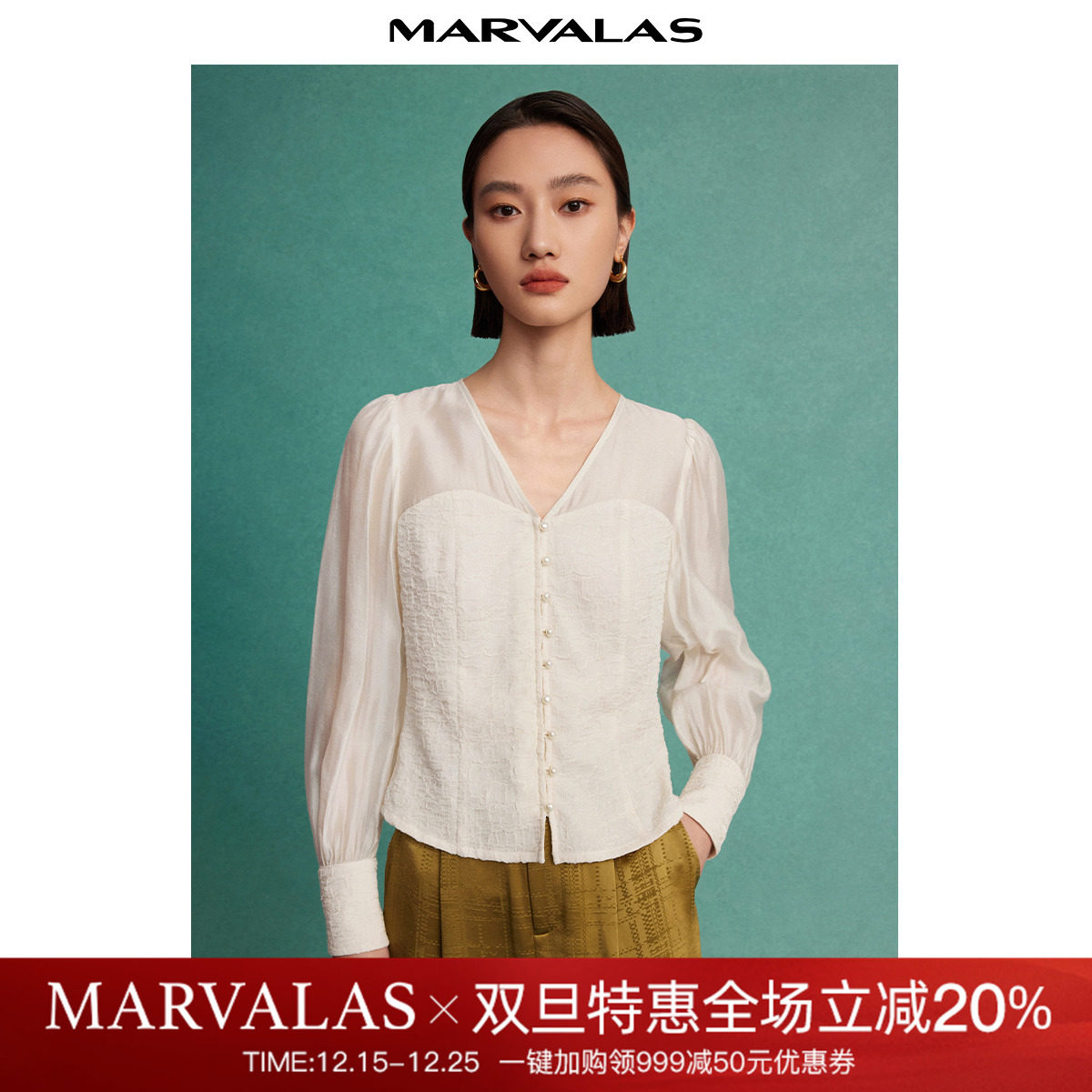 曼德诗设计感雪纺衫2025春秋新款复古抹胸式拼接V领纯色气质小衫