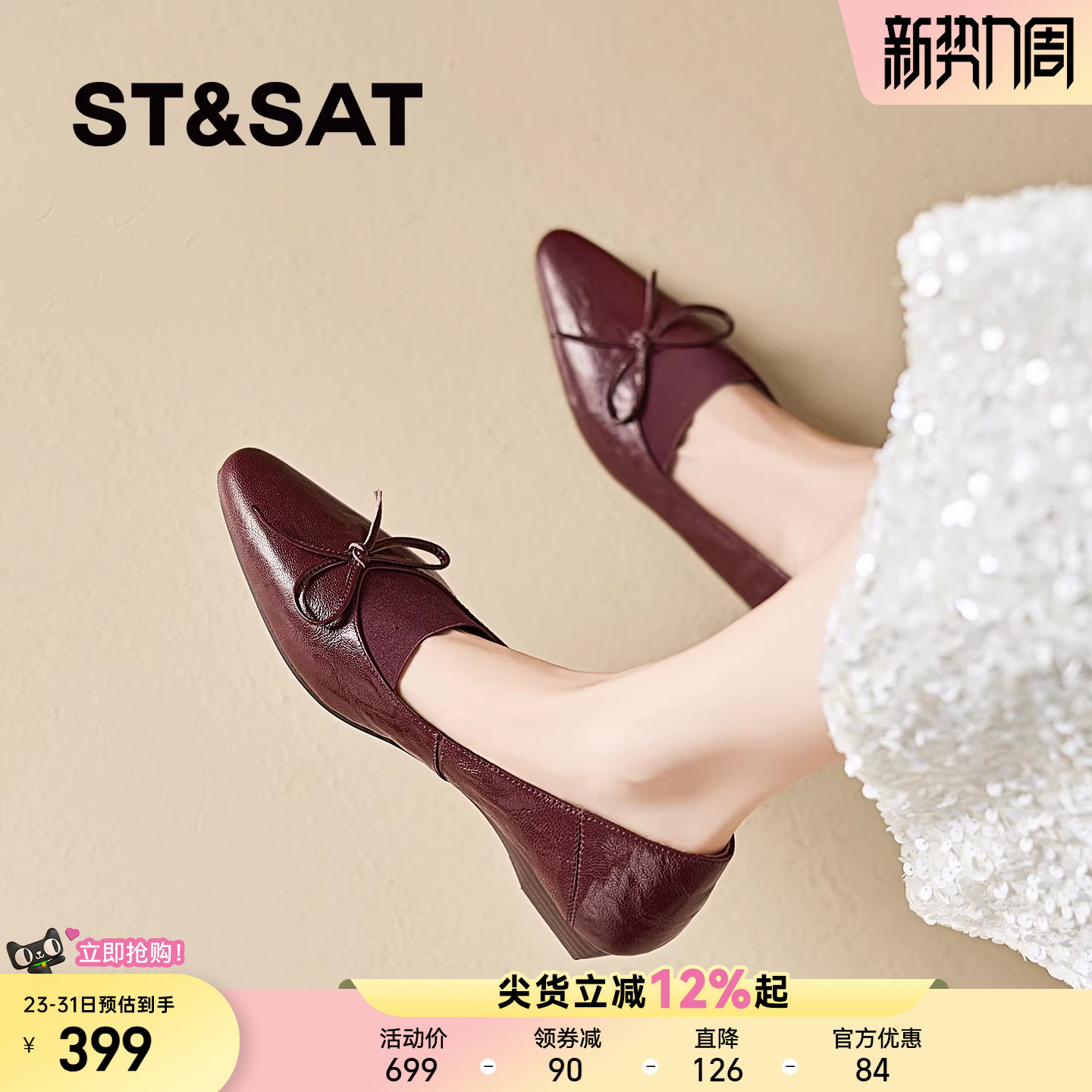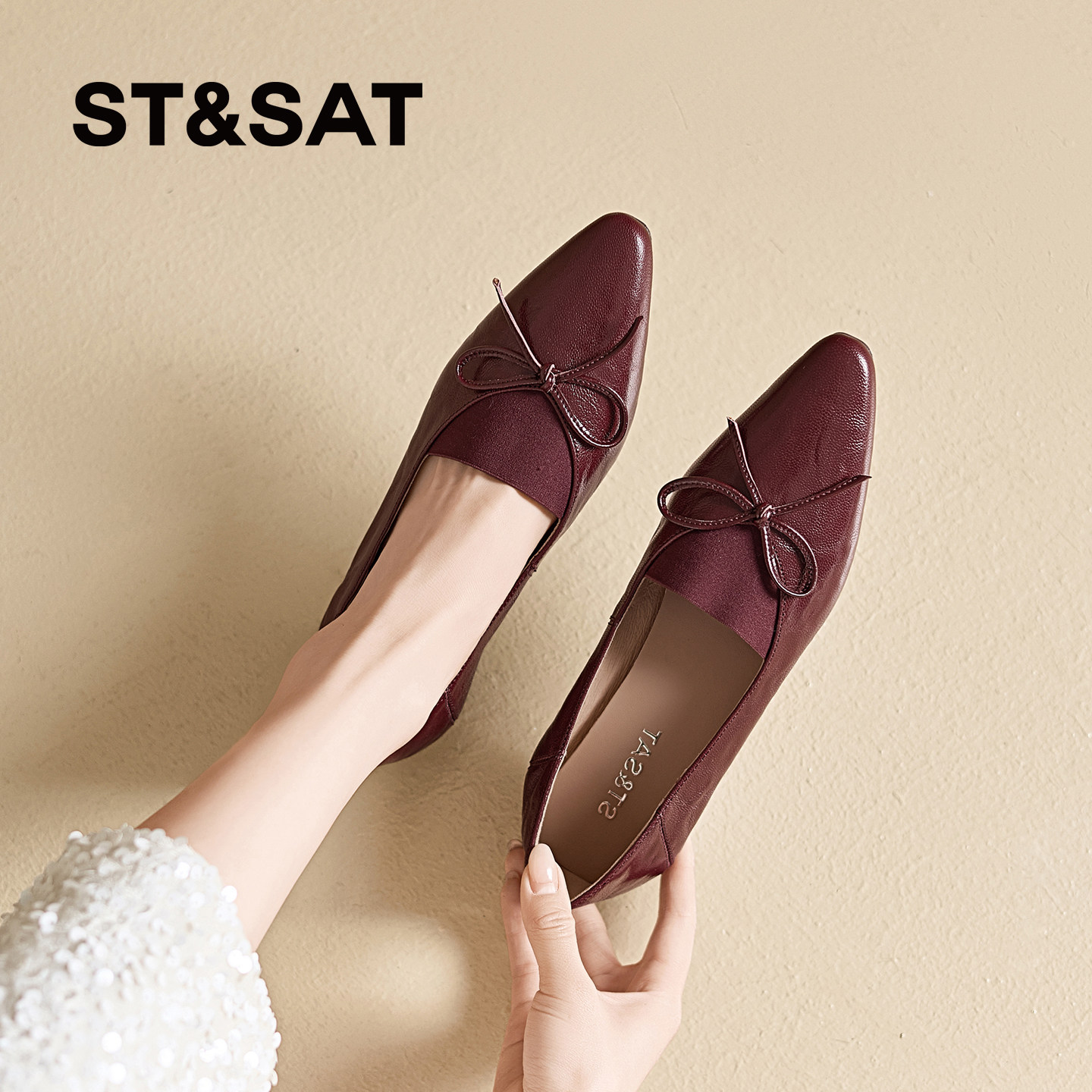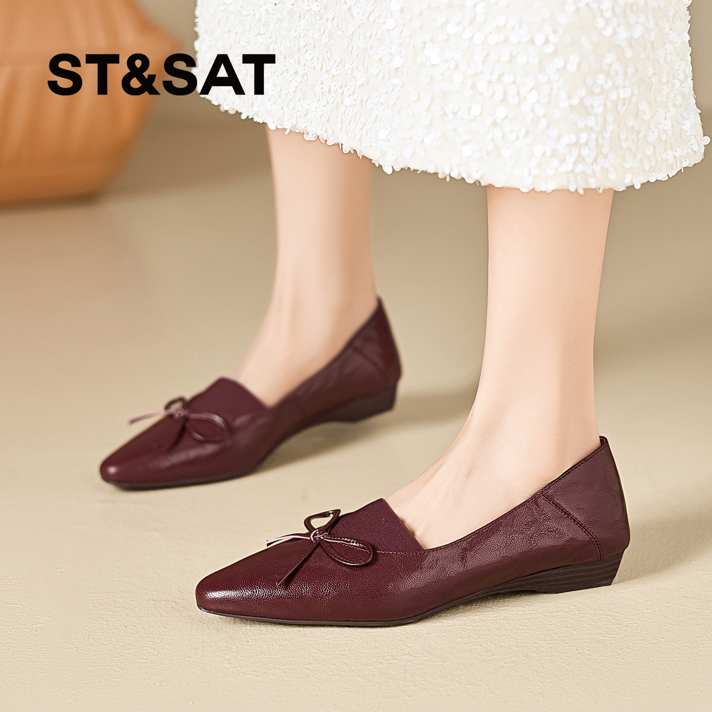 星期六优雅风尖头平底鞋女坡跟单鞋蝴蝶结小皮鞋不累脚真皮女鞋子