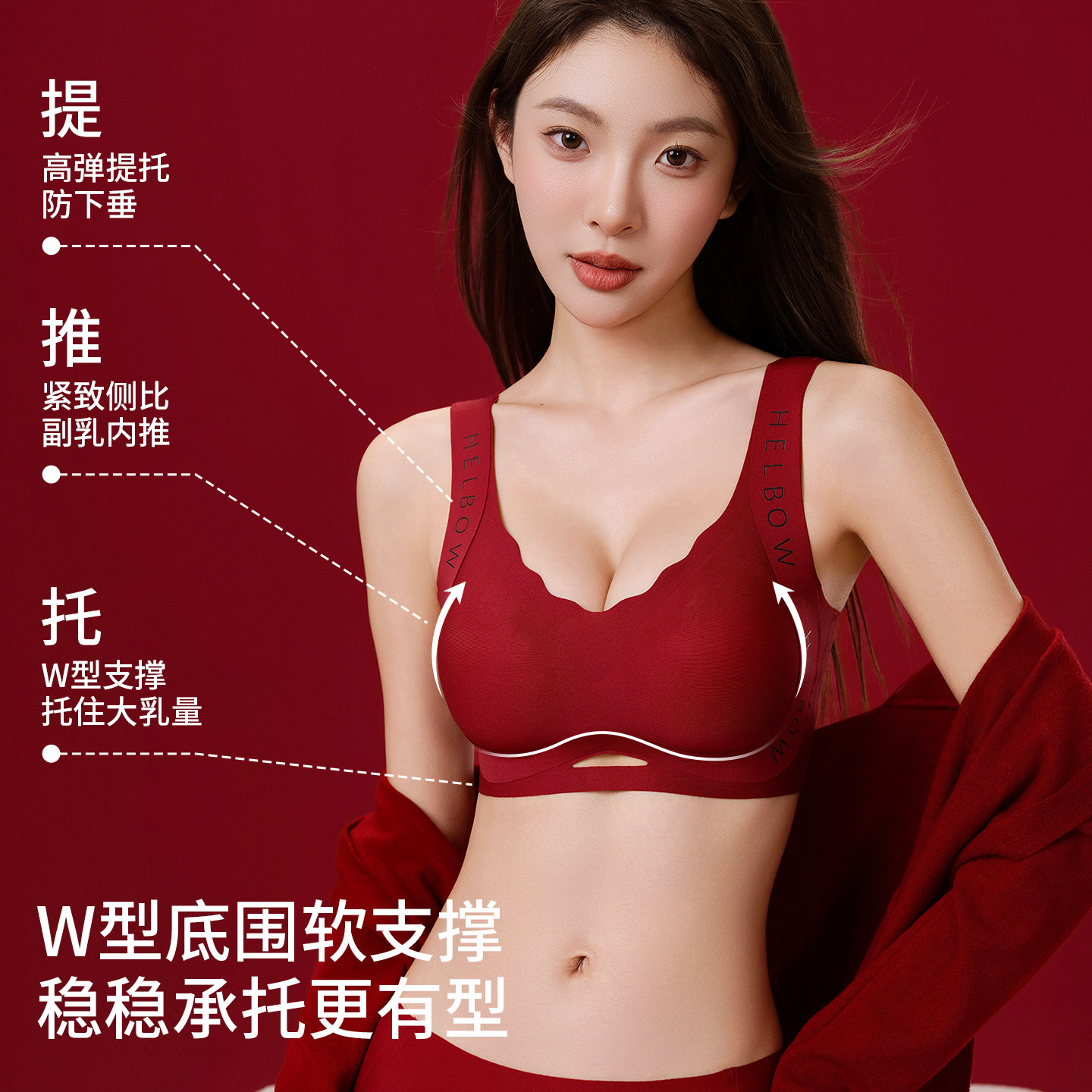 润微提拉女王内衣女大胸显小红色大码调整形聚拢收副乳防下垂文胸