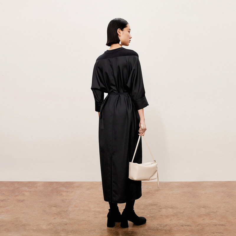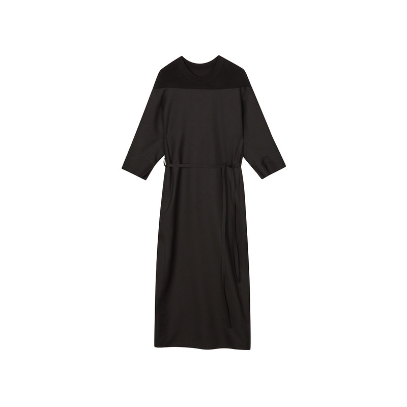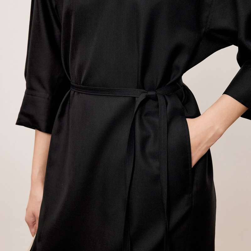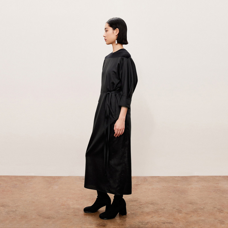 LESS系带收腰连衣裙春秋通勤黑精纺休闲圆领七分袖长裙2O7G11140