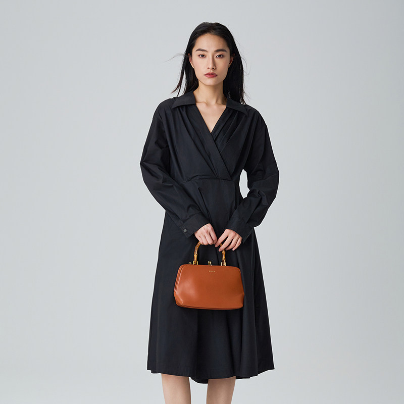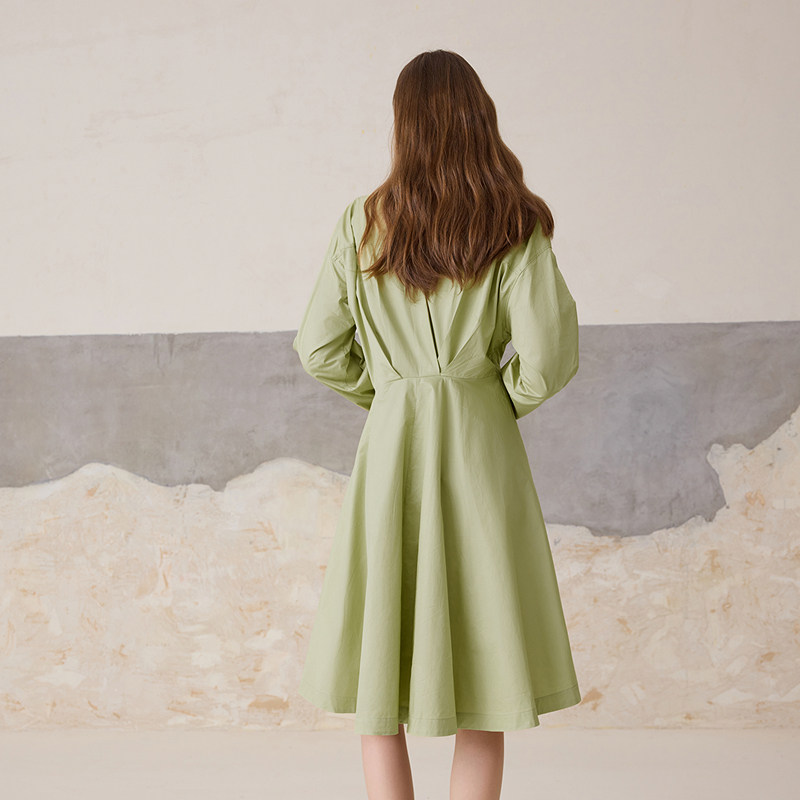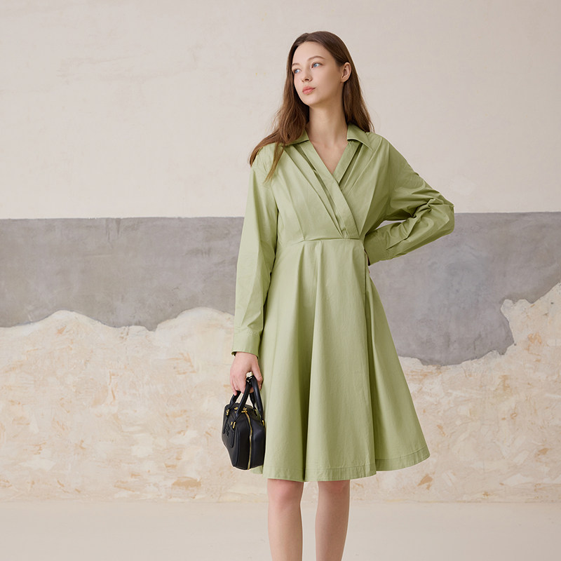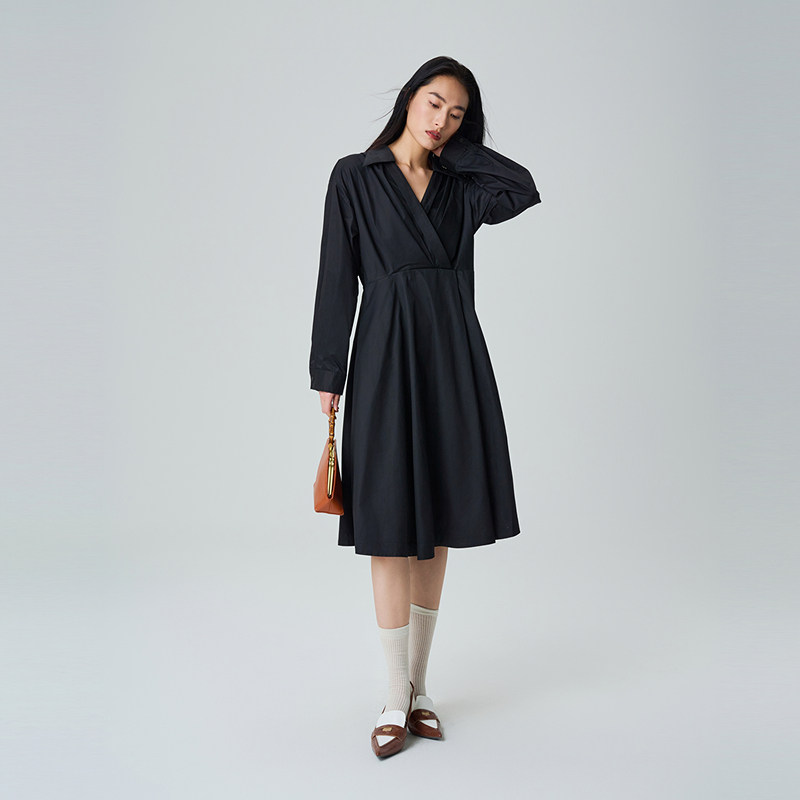 小V领;内襟翻折暗扣设计;复古压褶大摆裙