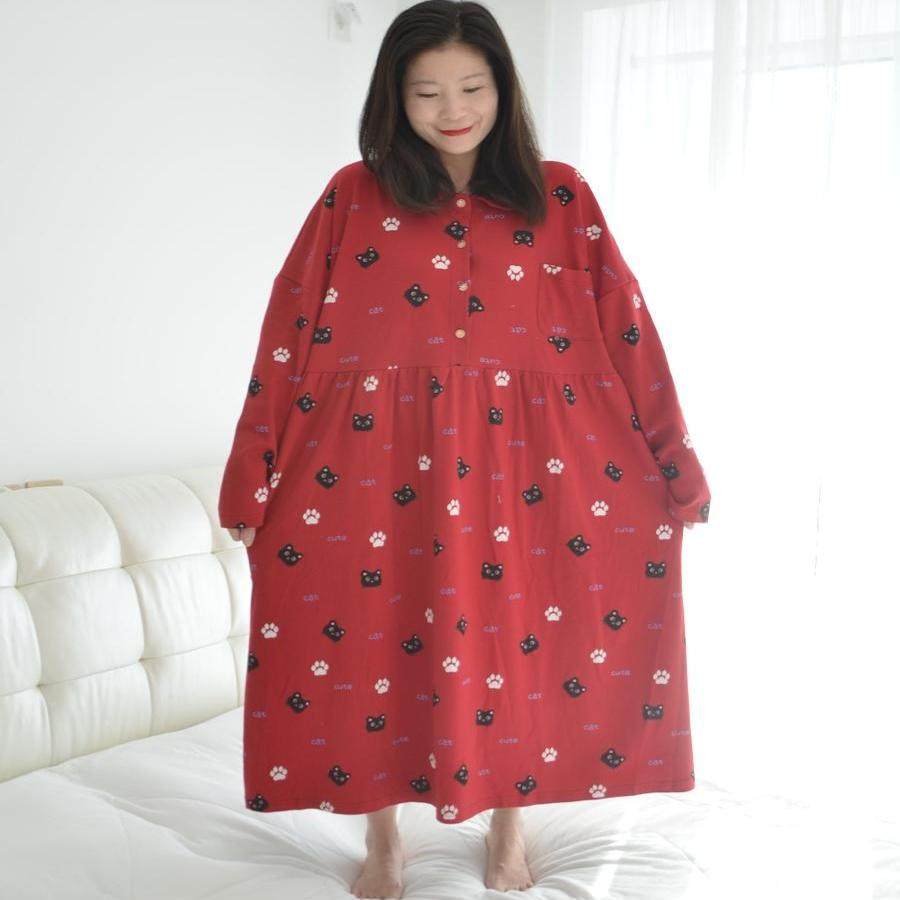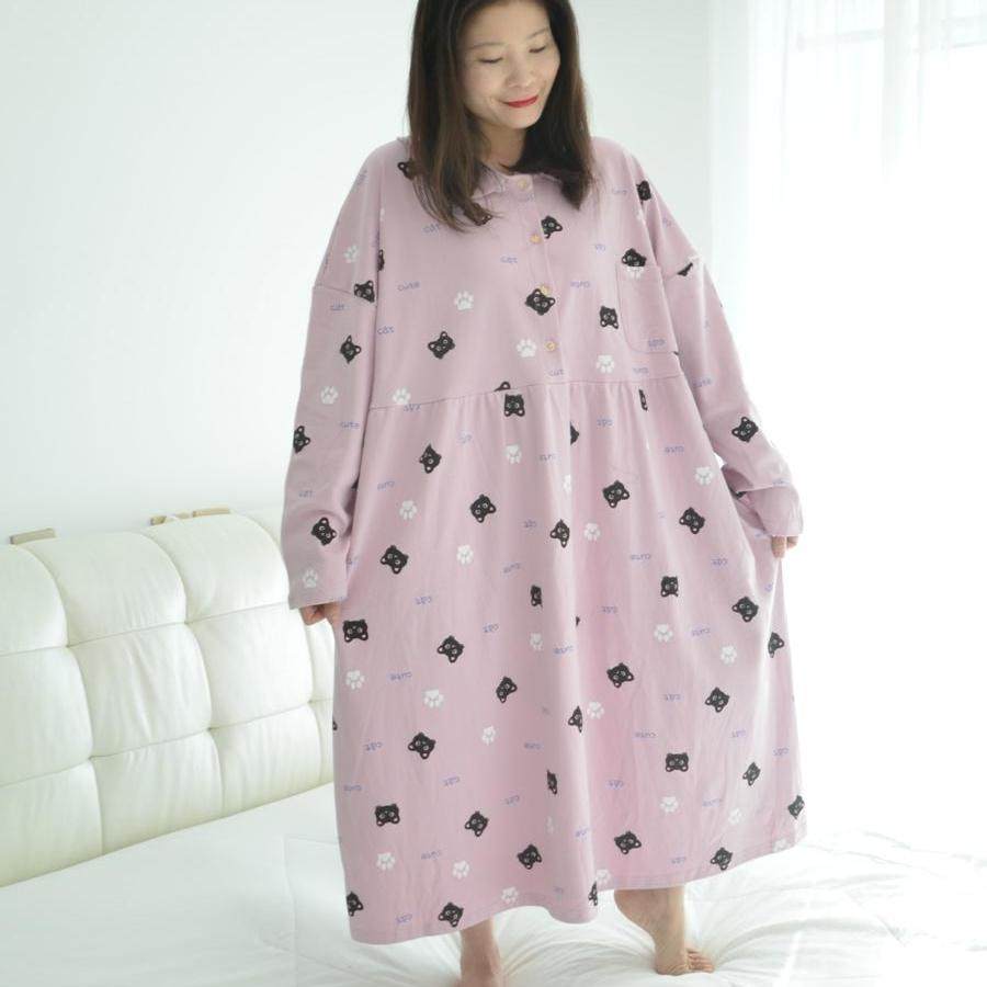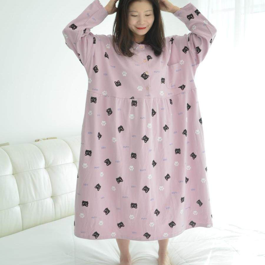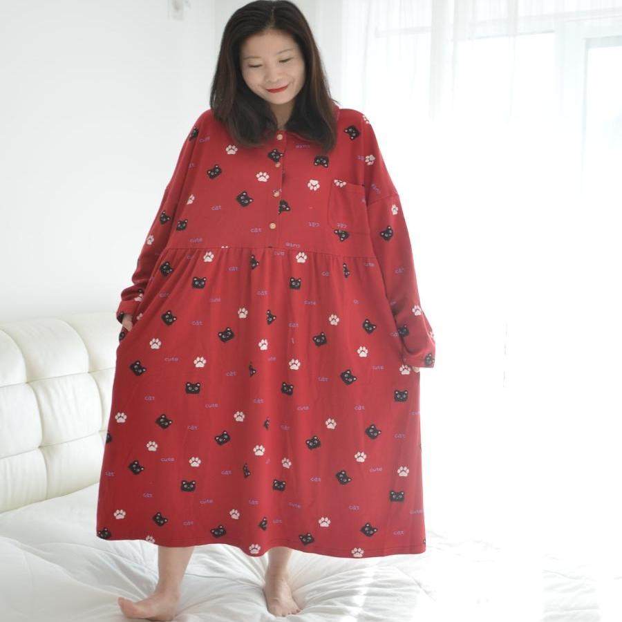 200斤加肥大码长款纯棉孕妇睡裙女胖MM春秋长袖卡通猫咪家居睡衣