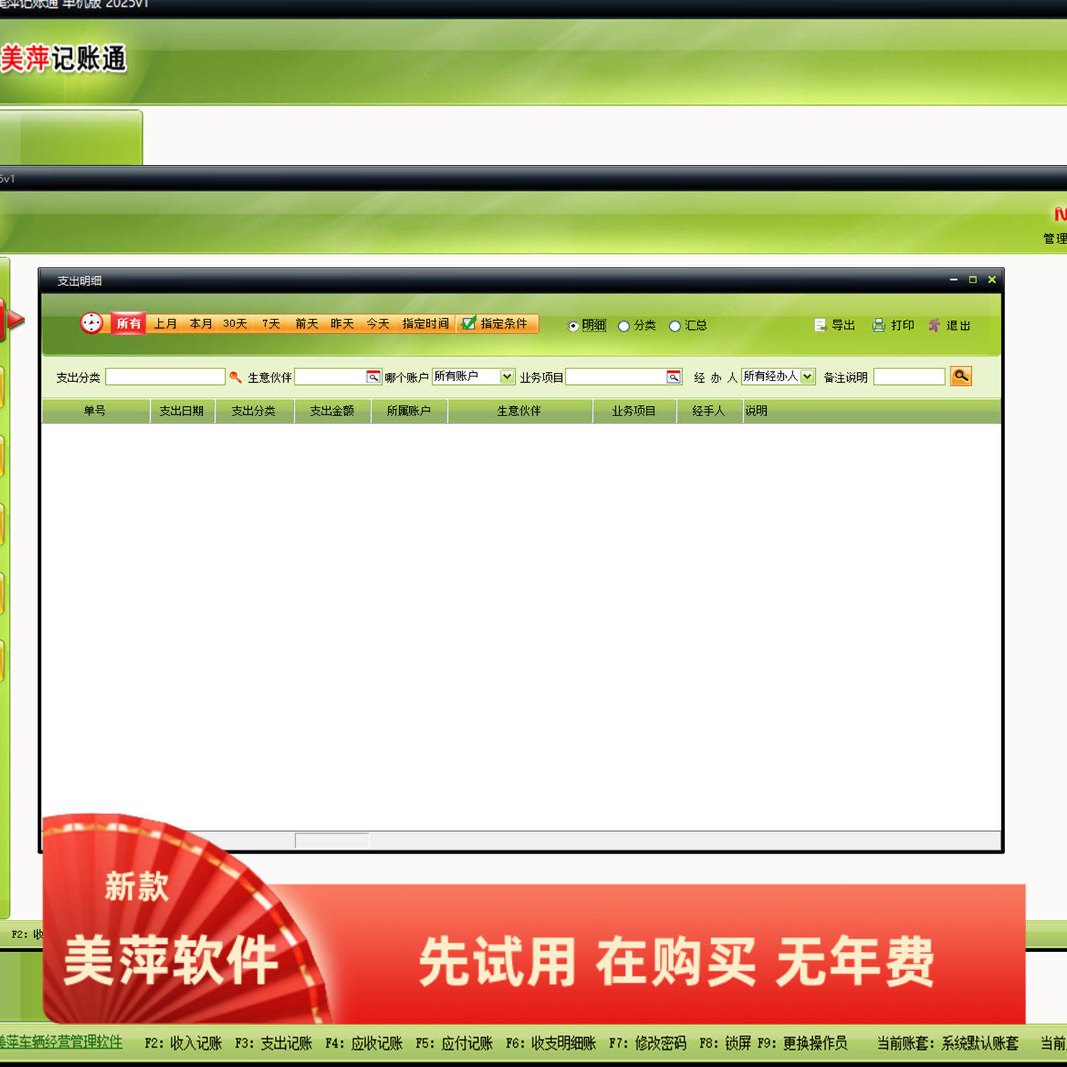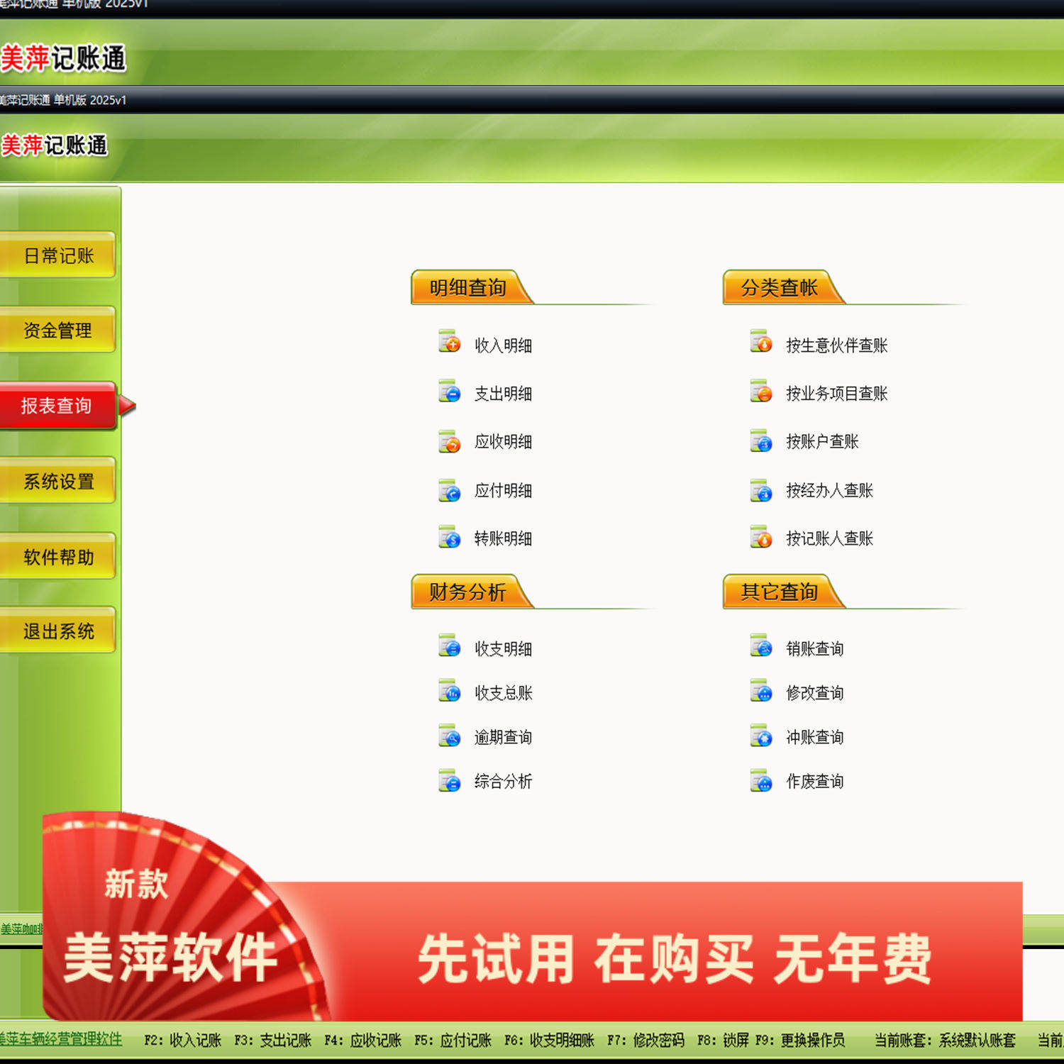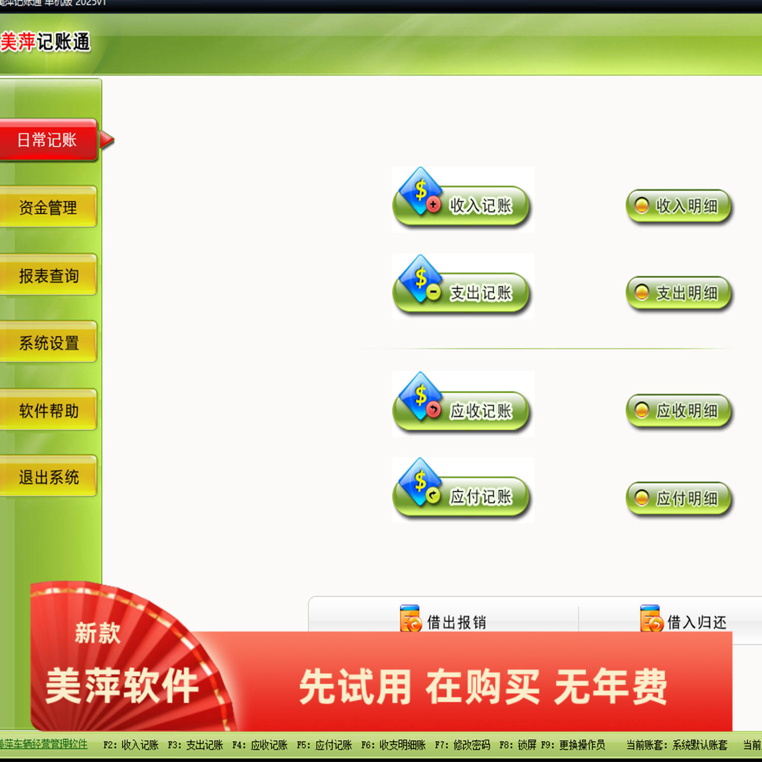 美萍记账通管理系统现金银行资金账目本流水应收应付欠款收支软件