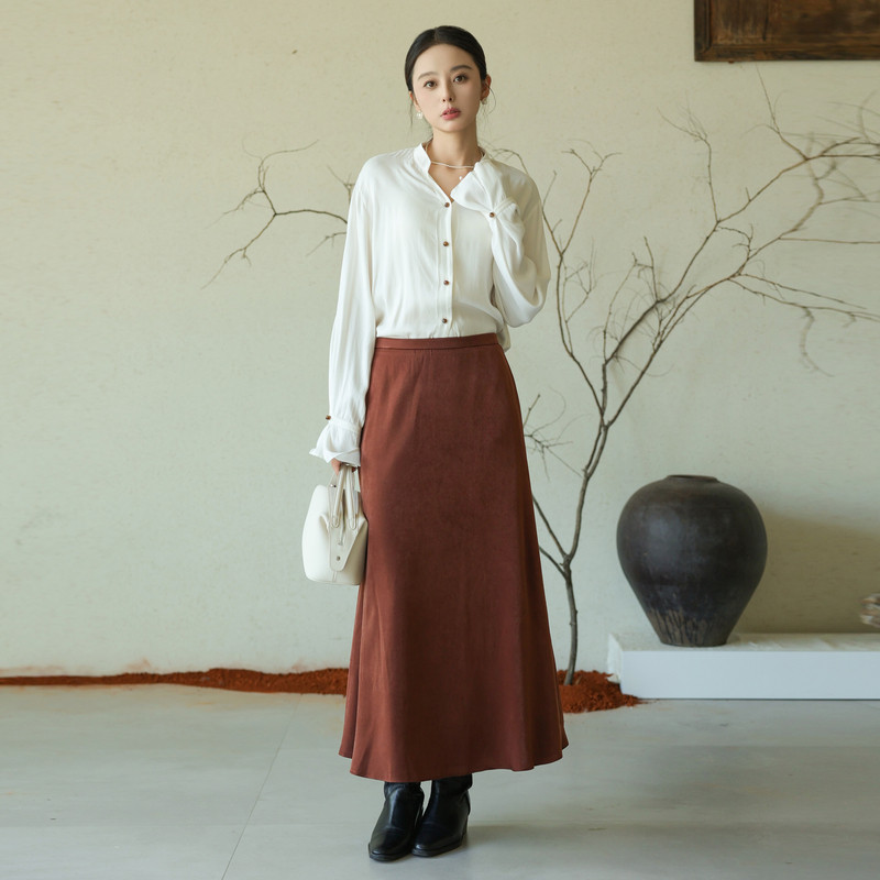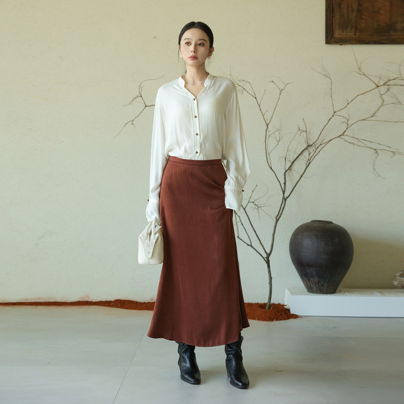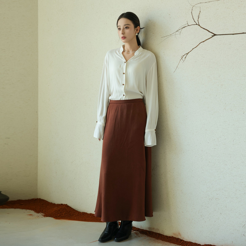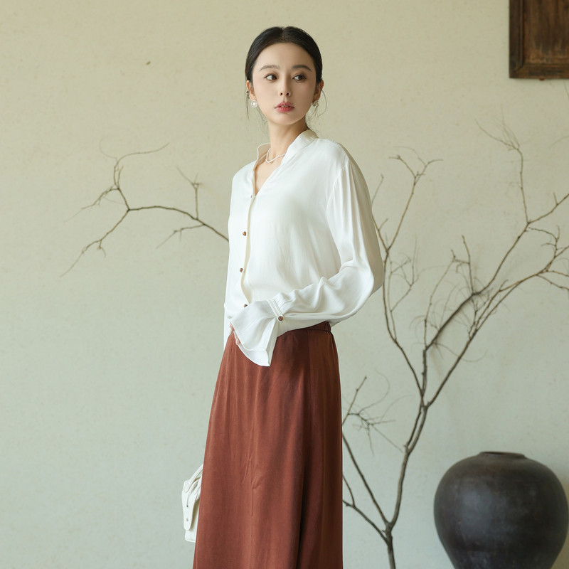 黑标BAIZHUO秋季新款新中式小V领简约慵懒风灯笼袖衬衫AZ43CS196