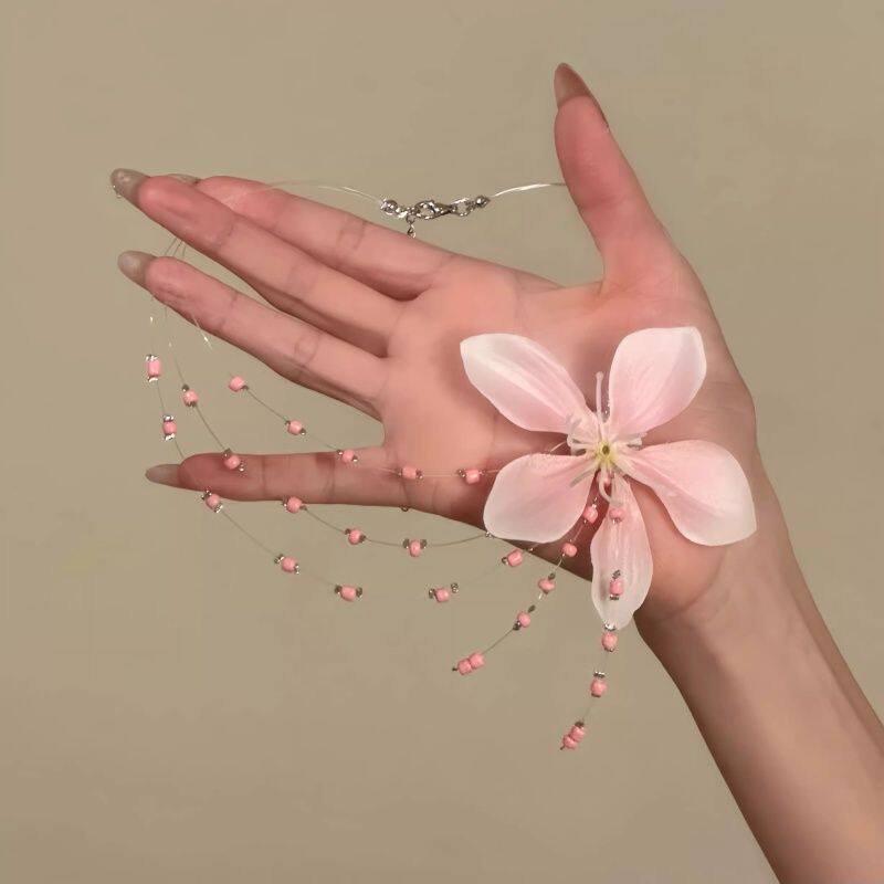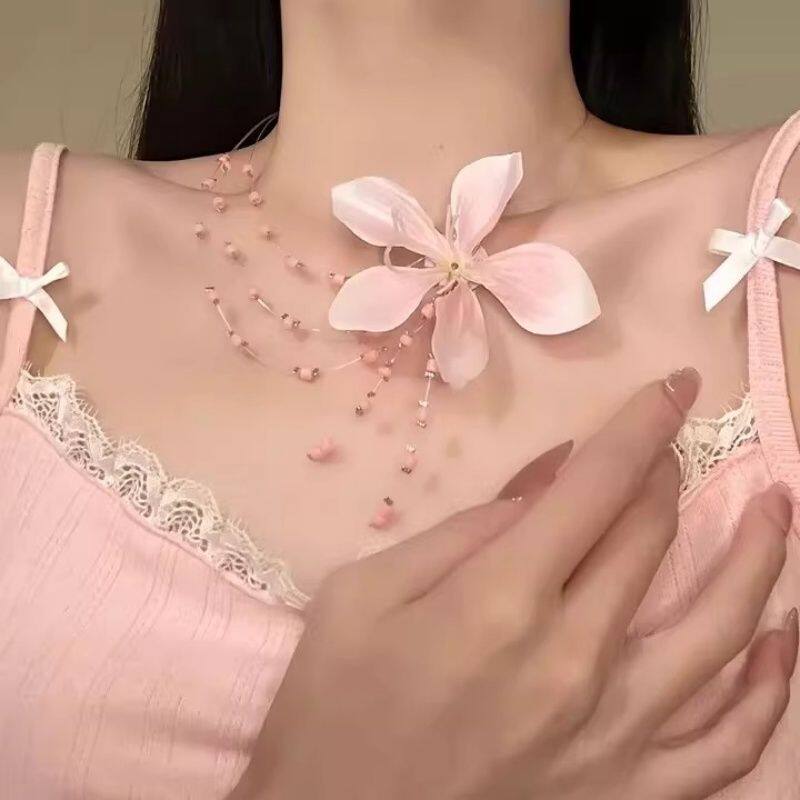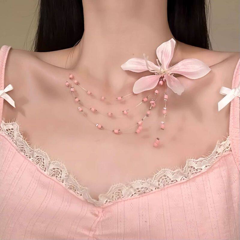 春夏季粉红色花朵串珠项链多层叠戴锁骨链choker海边氛围感颈链